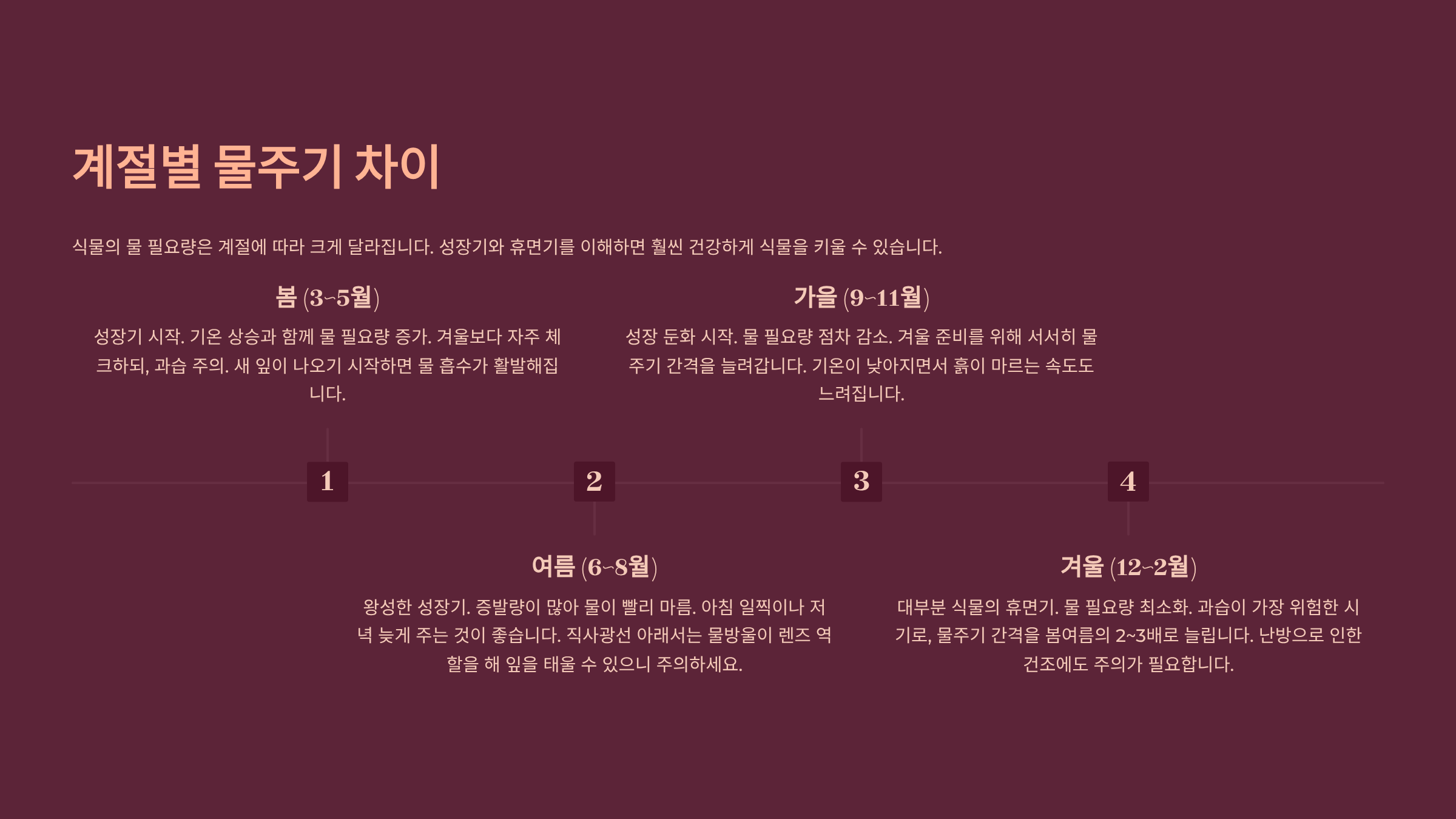봄과 가을은 식물이 활발히 자라는 시기라 물 흡수도 빠르고, 여름에는 햇빛과 온도 때문에 빨리 말라요. 반대로 겨울엔 식물도 휴식기에 들어가니 물은 정말 천천히 줘야 해요.