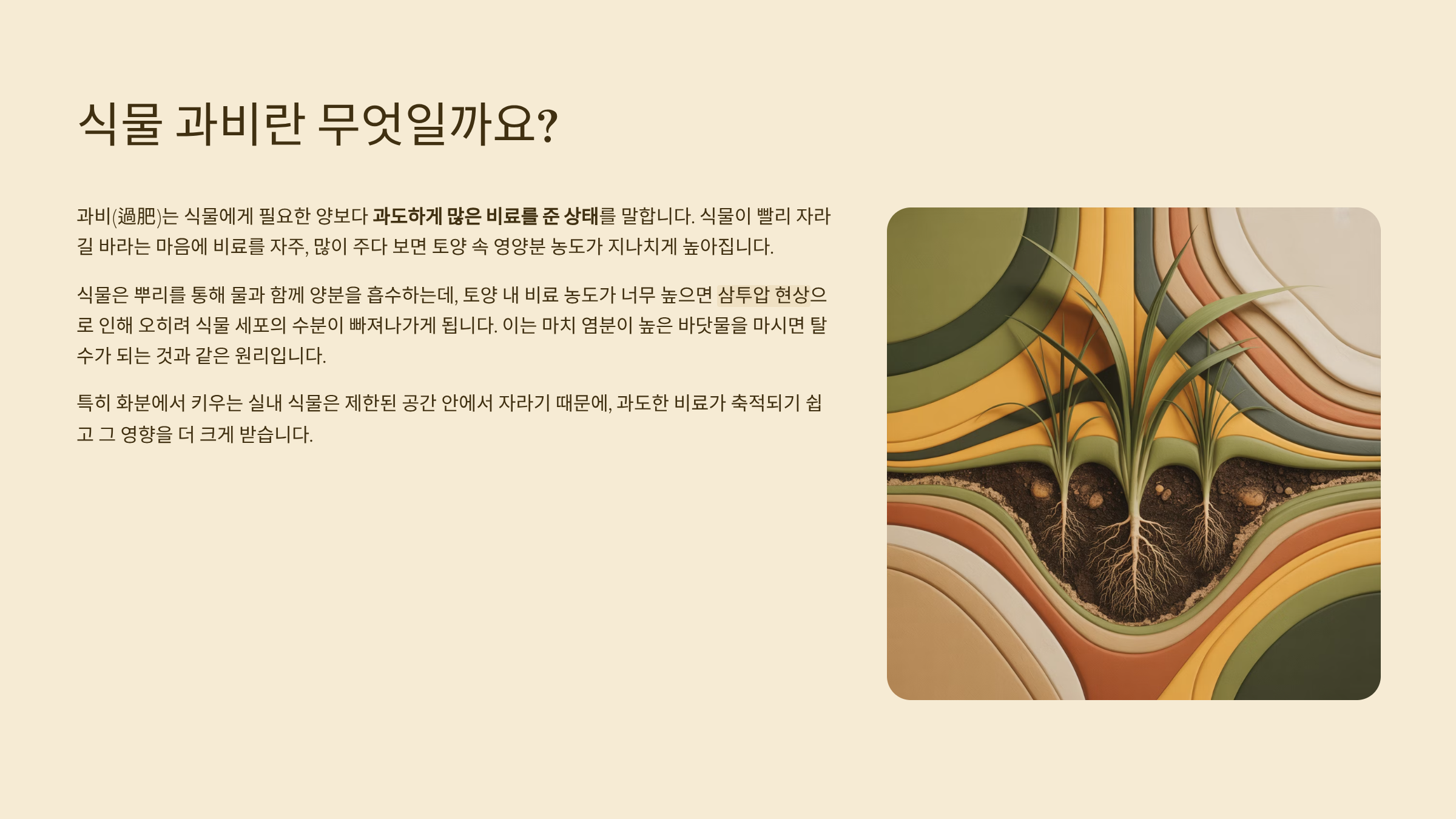 비료를 너무 자주 주거나 한 번에 너무 많이 주면, 흙에 영양분이 축적되면서 농도가 짙어져요. 이때 뿌리가 그 염분을 감당하지 못하면 식물이 오히려 수분을 빼앗기고 말라버려요. 특히 뿌리 끝이 손상되면서 흡수력이 떨어지고, 결국 위쪽 잎까지 문제가 생기는 거죠.