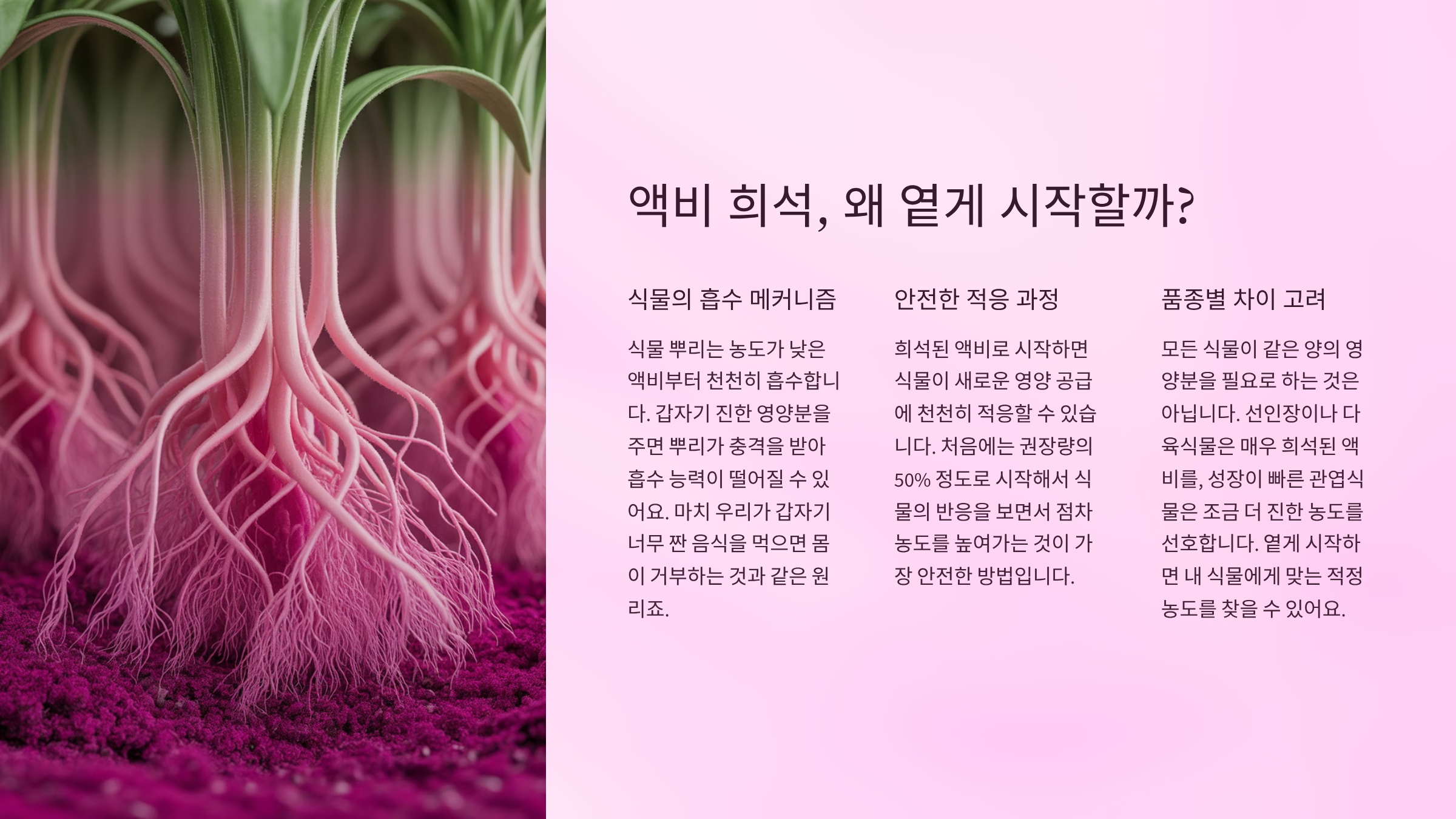 이제 본격적으로 왜 처음엔 희석해서 줘야 하는지, 구체적인 이유와 사례, 실제 실험 자료까지 살펴보면서 액비 사용법을 완전히 이해해볼게요!