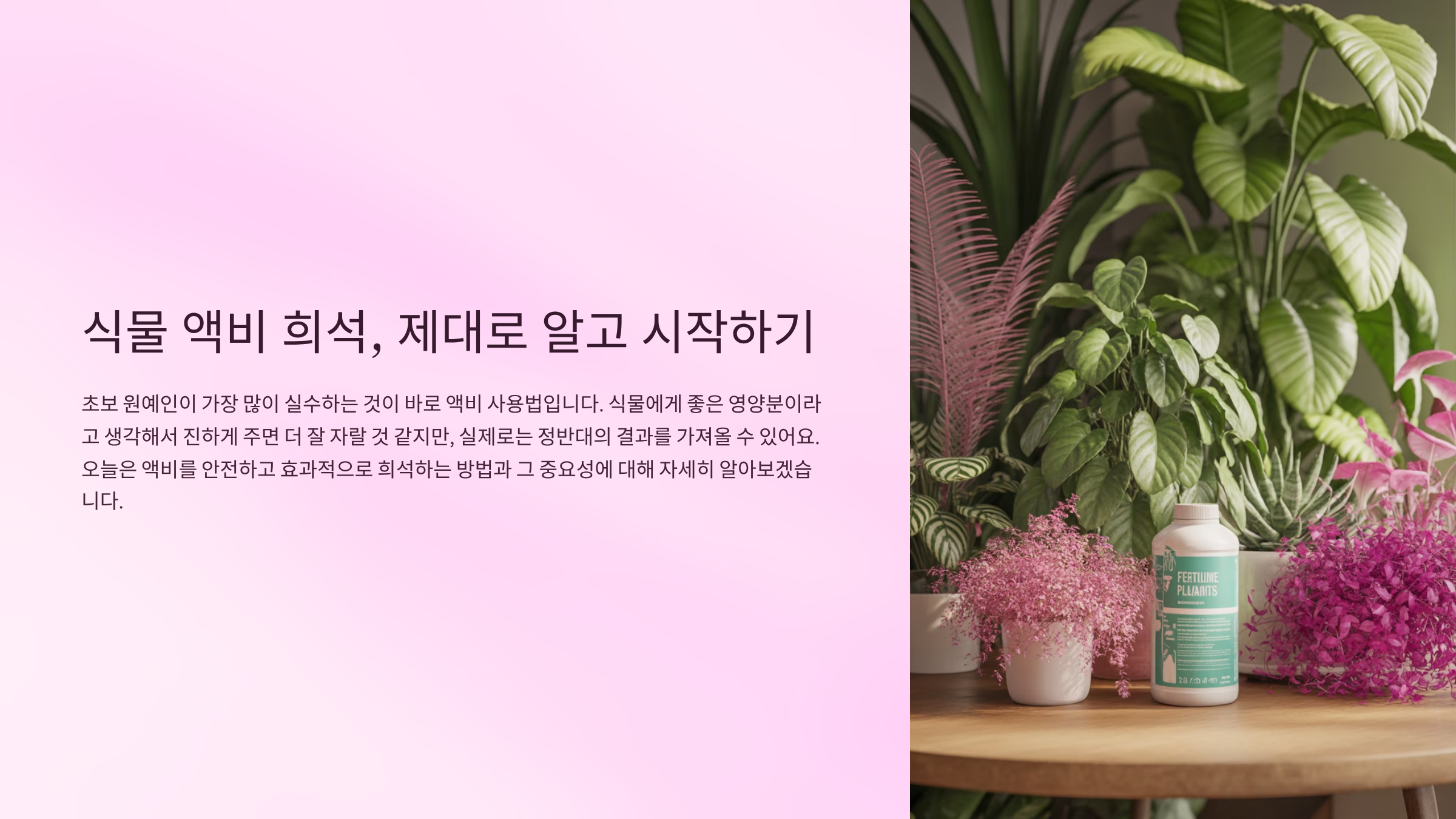 식물에게 액비를 줄 때, 많은 초보 가드너들이 겪는 실수가 바로 '라벨에 적힌 희석비'를 그대로 따라하는 거예요. 하지만 식물은 사람처럼 체력이 다 다르고, 환경마다 반응이 다르기 때문에 처음엔 절반 이하로 희석해서 천천히 적응시키는 게 좋아요.
