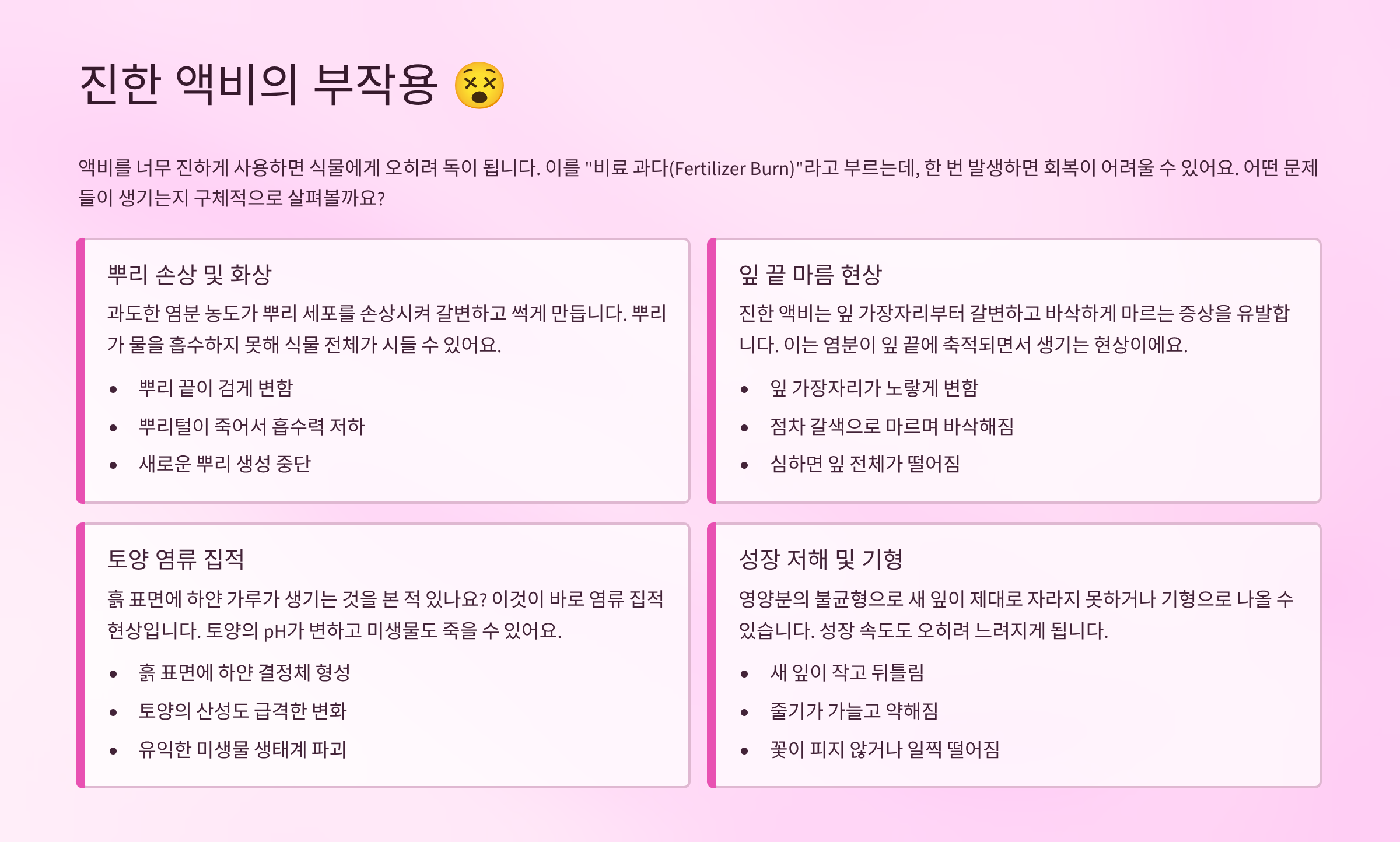 또한 액비가 너무 진하면 광합성에 방해가 되는 방식으로 식물의 엽록체 작용을 방해할 수 있어요. 이로 인해 잎이 힘없이 처지거나 색이 연해지기도 해요.