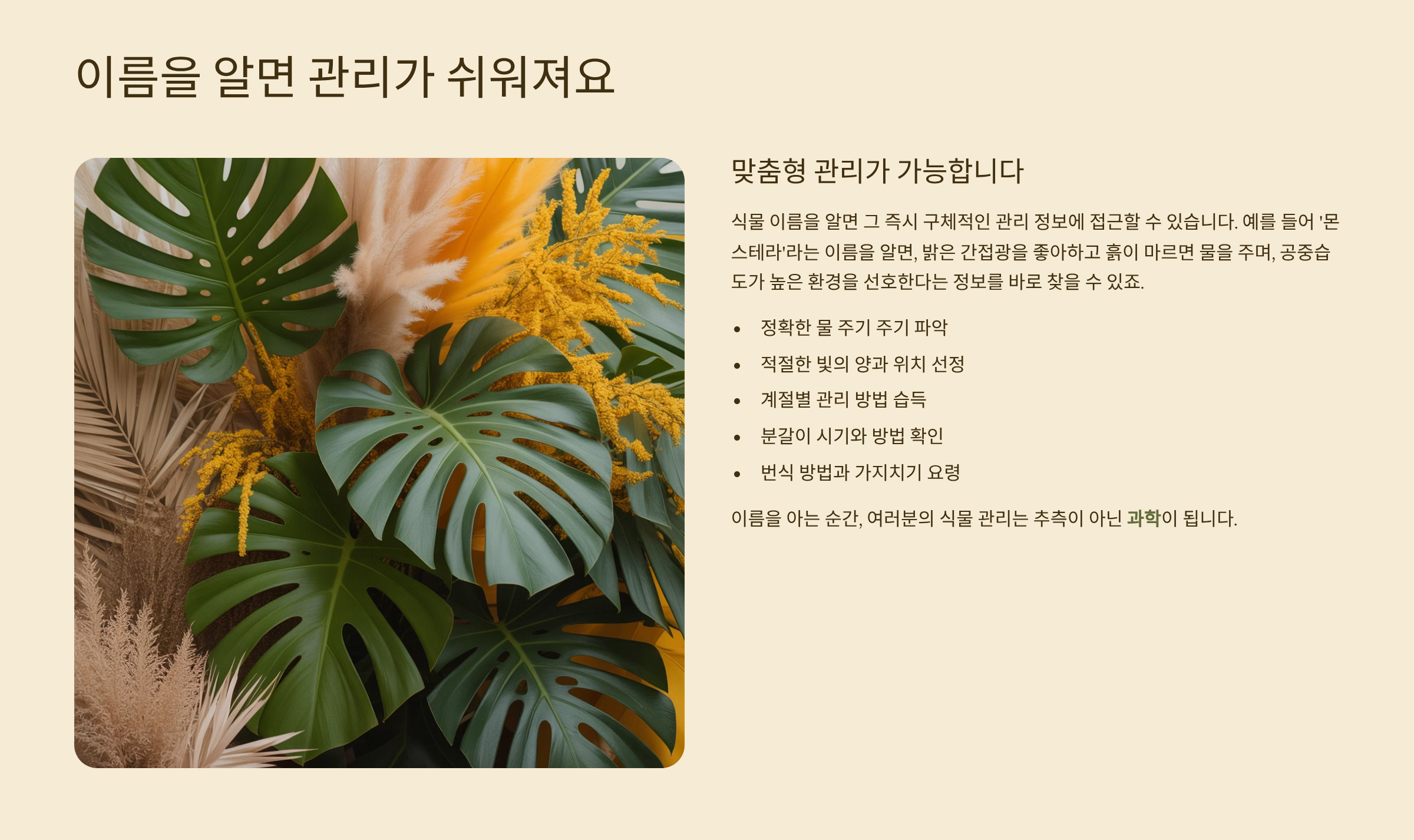 다음 섹션에서는 식물 이름을 알고 있으면 얼마나 관리가 쉬워지는지 구체적으로 알려드릴게요! 🤗