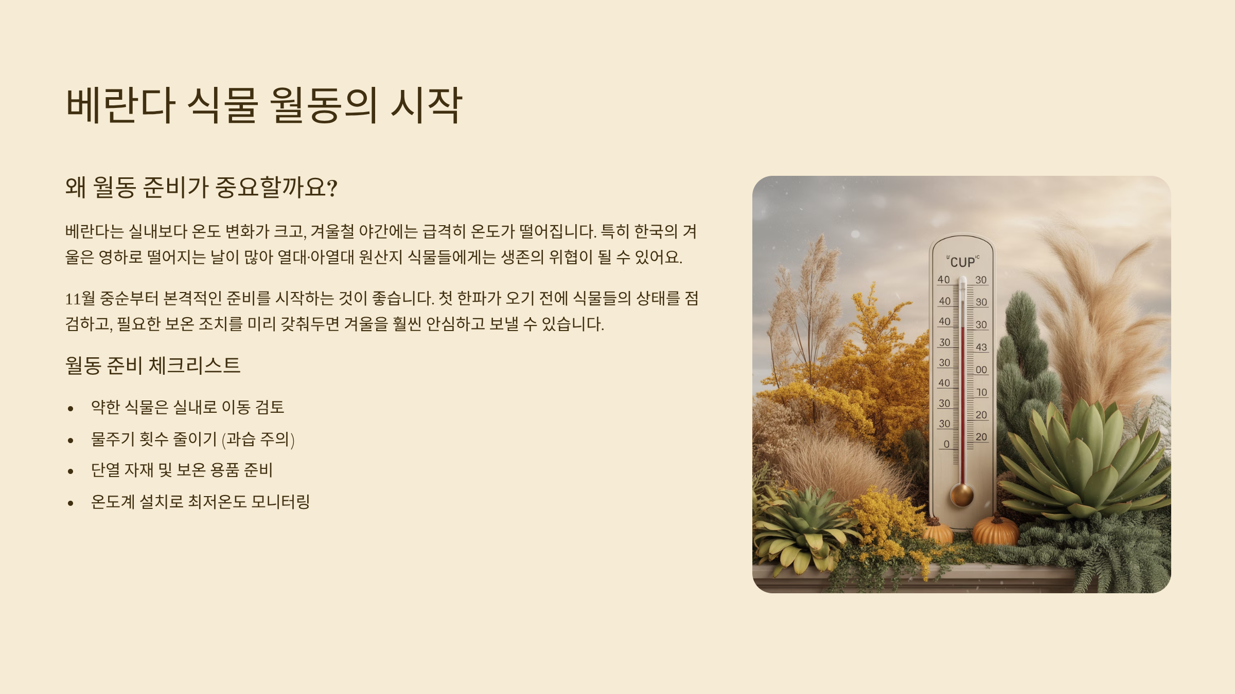 날씨가 추워지면 식물을 키우는 사람이라면 꼭 준비해야 하는 게 바로 ‘월동 준비’예요. 특히 베란다처럼 외부와 맞닿아 있는 공간은 한밤중 최저 기온이 급격히 떨어질 수 있어서, 식물 생존에 위협이 될 수 있답니다.