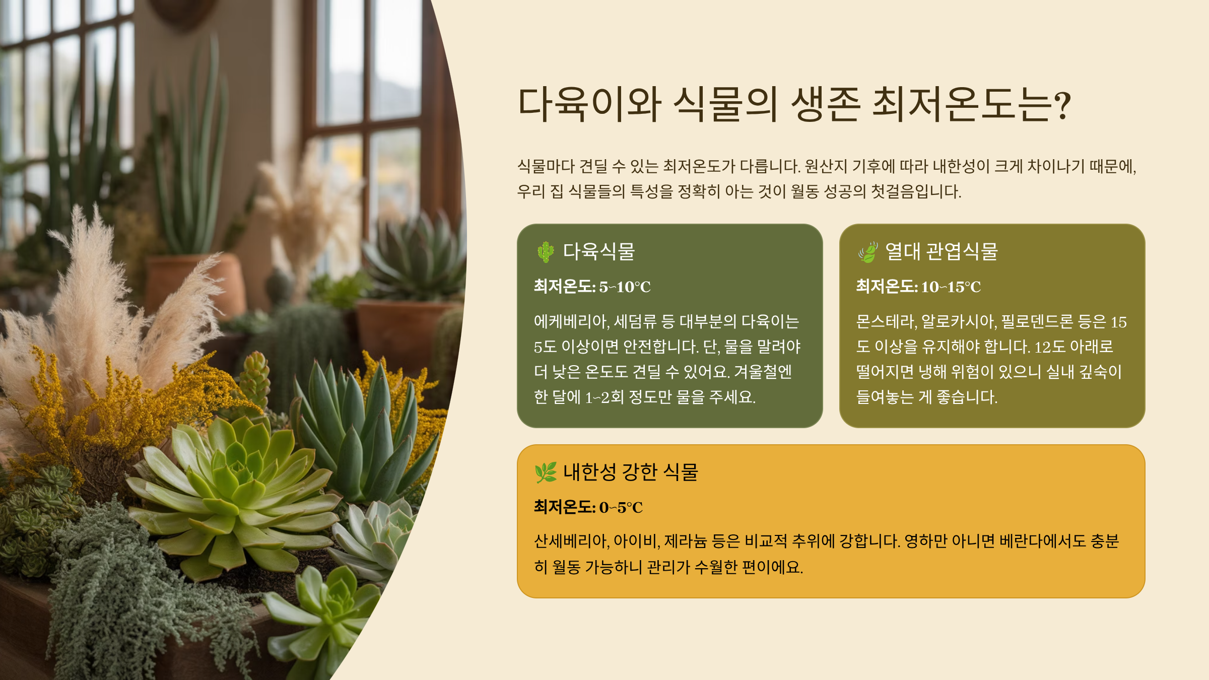 실제로 다육이나 선인장 종류는 5~10℃ 이하로 온도가 떨어지면 냉해를 입을 수 있고, 열대성 식물은 더 높은 온도를 유지해줘야 해요. 하지만 걱정하지 마세요! 지금부터 하나하나 꼼꼼히 알려드릴게요.