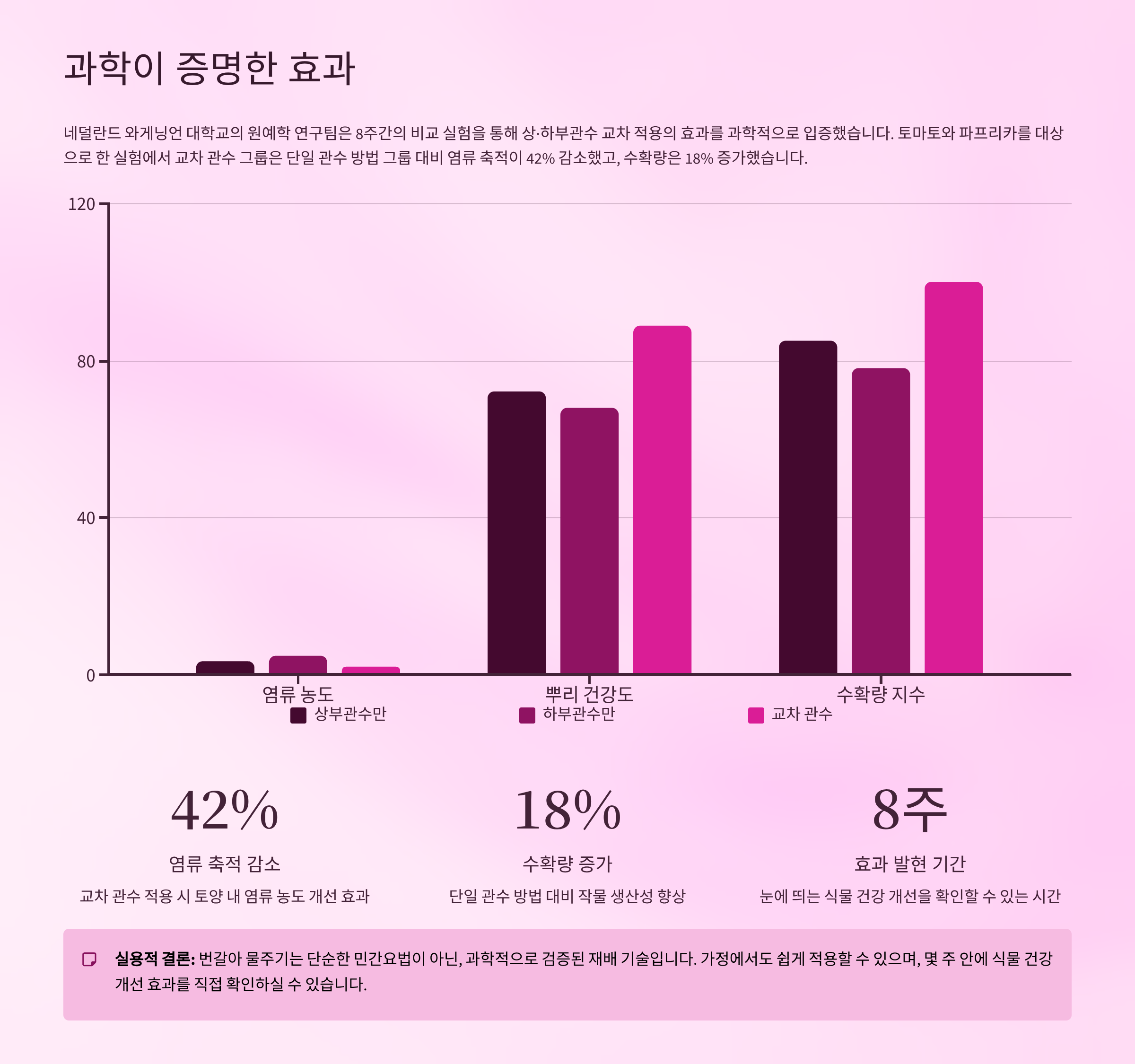많은 원예 전문가와 농업 기술자들이 상·하부관수를 번갈아 사용하는 방법의 효과를 과학적으로 입증해 왔어요. 실제로 다육식물, 허브, 채소, 심지어는 묘목 재배에서도 이 방법이 탁월한 결과를 보여줬죠.