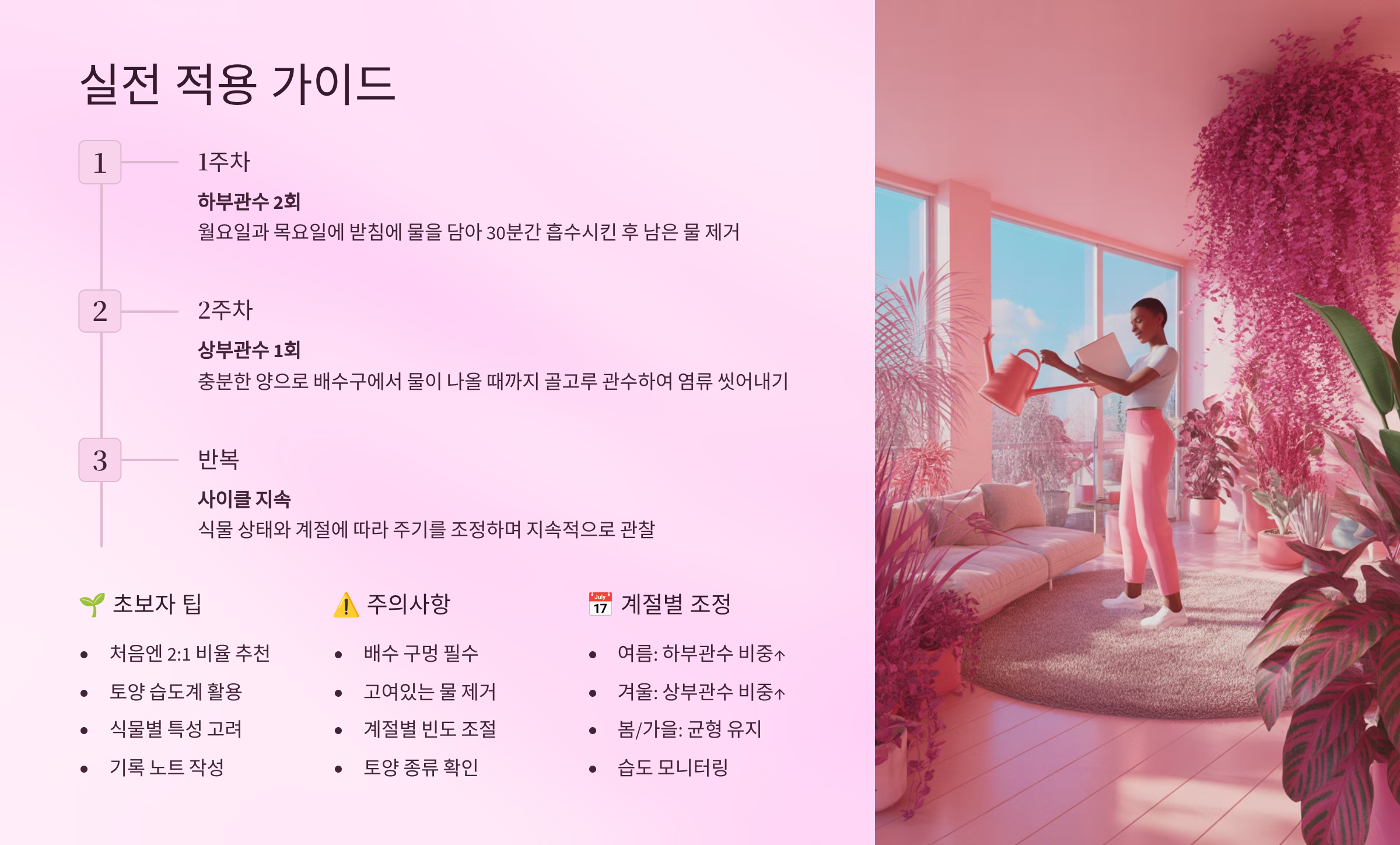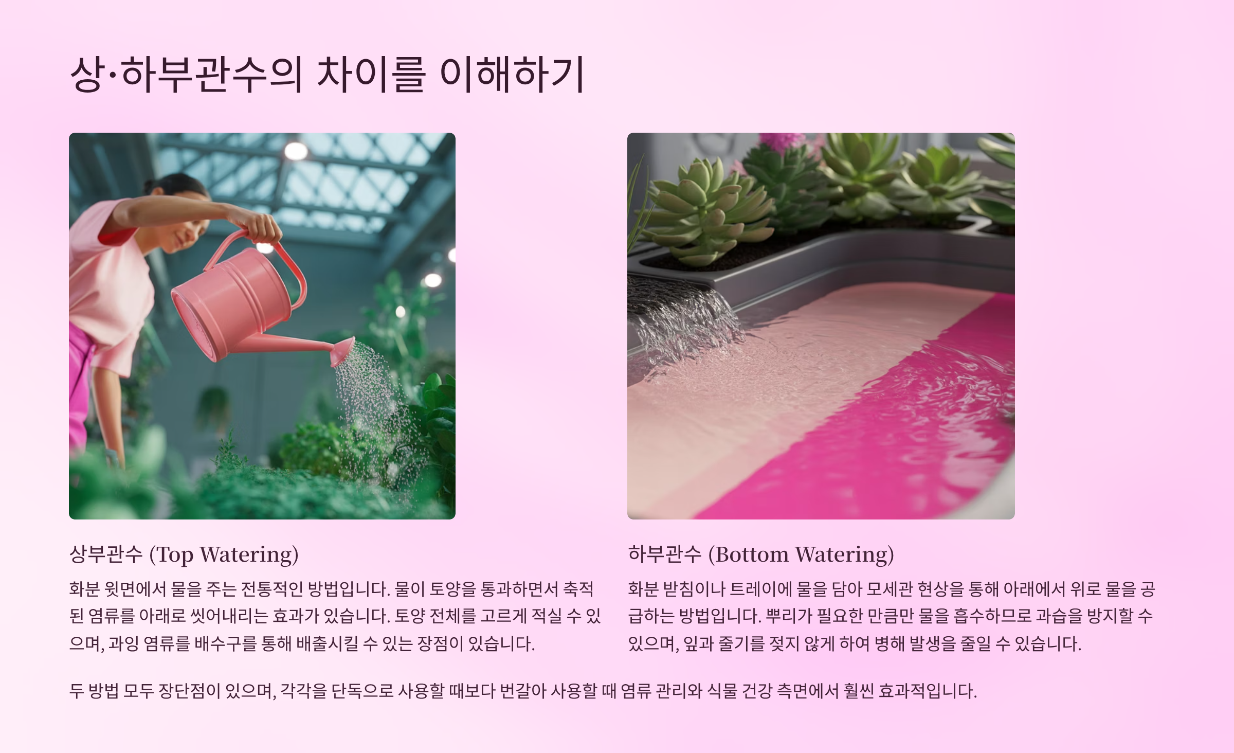 그래서 전문가들이 추천하는 방법은 바로 **상·하부관수를 번갈아 하는 것!** 일정 주기로 방식만 바꿔줘도 뿌리는 촉촉하게 유지되면서도 염류가 씻겨 내려가요. 마치 헹굼+보습을 같이 해주는 느낌이라고 할 수 있어요.