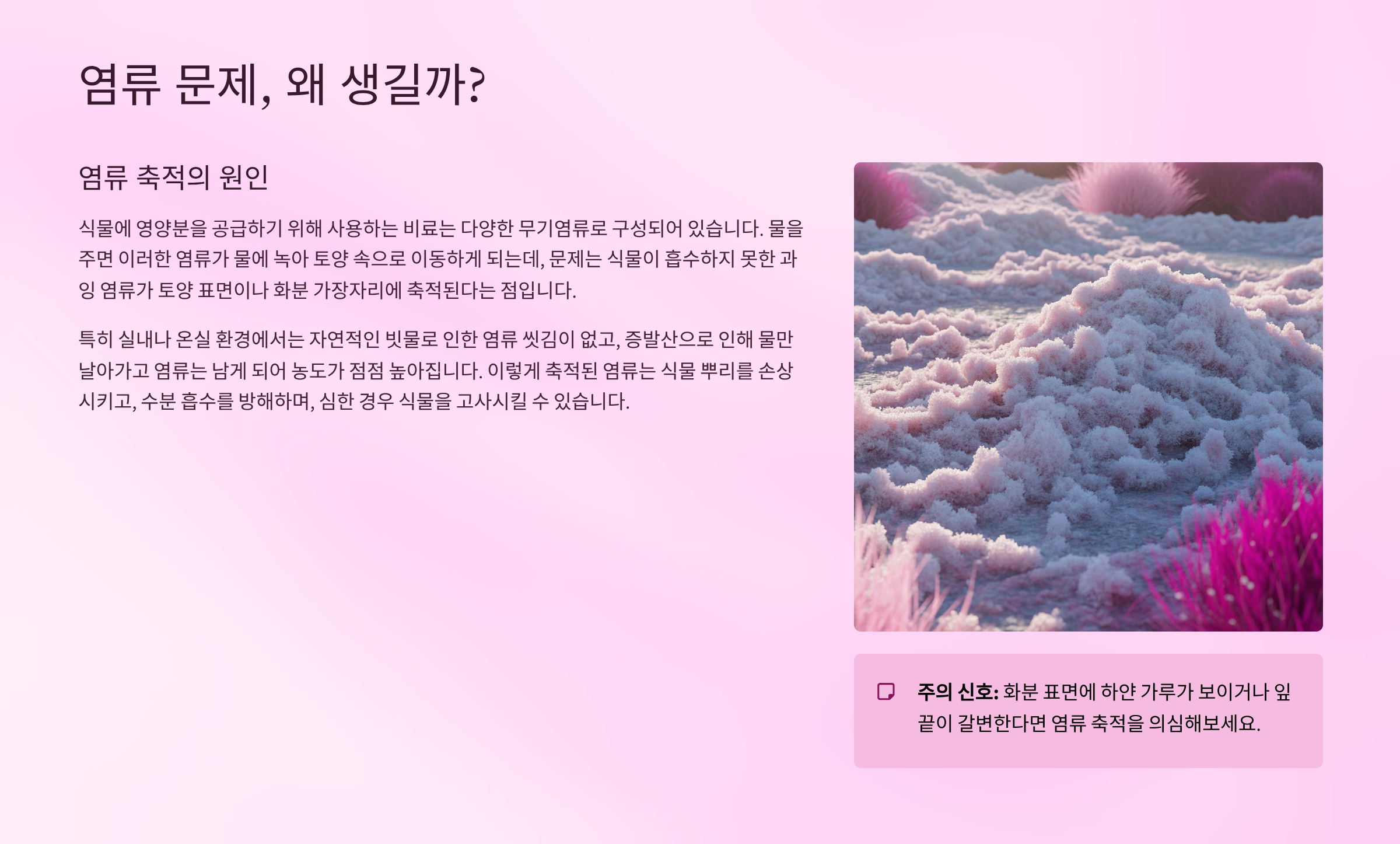 식물을 키우다 보면 흙 위에 하얗게 뜨는 정체불명의 소금기 같은 걸 본 적 있지 않나요? 이건 바로 염류(소금, 비료 성분 등)가 축적된 결과예요. 식물이 물을 흡수하고 난 뒤 남는 무기질이 계속 쌓이면서 뿌리 생장을 방해하고, 결국 잎이 말라가는 스트레스 증상이 나타나게 되죠.