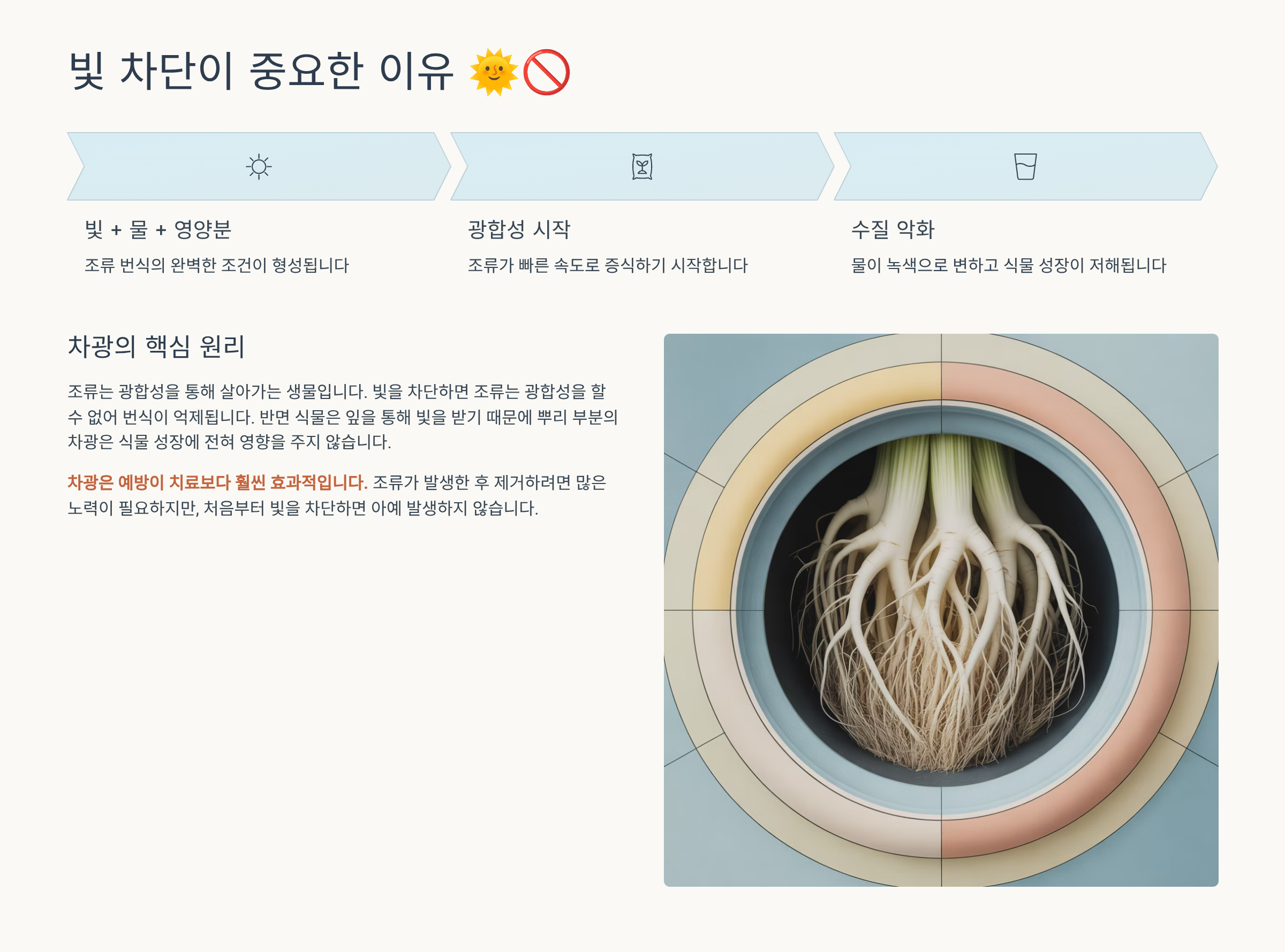 그래서 '빛 차단'은 수경재배를 하는 사람이라면 꼭 알아야 할 핵심 관리법이에요. 어떻게 하면 식물은 잘 자라면서도 조류는 억제할 수 있을까요? 지금부터 하나씩 알려드릴게요! 🌱