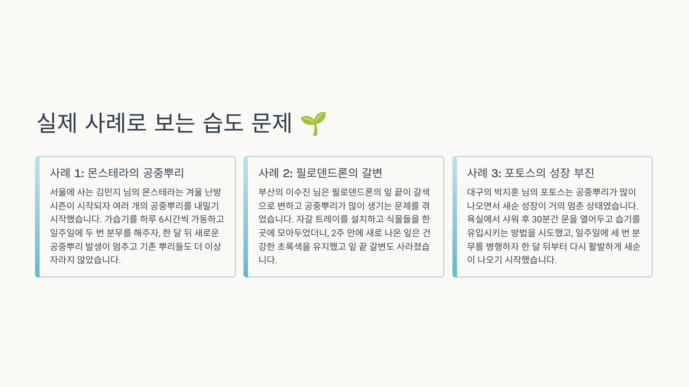 | 초록맘 | 난방 후 몬스테라에 공중뿌리 발생 | 가습기 + 아침 분무 | 공중뿌리 줄고 잎 상태 개선 |