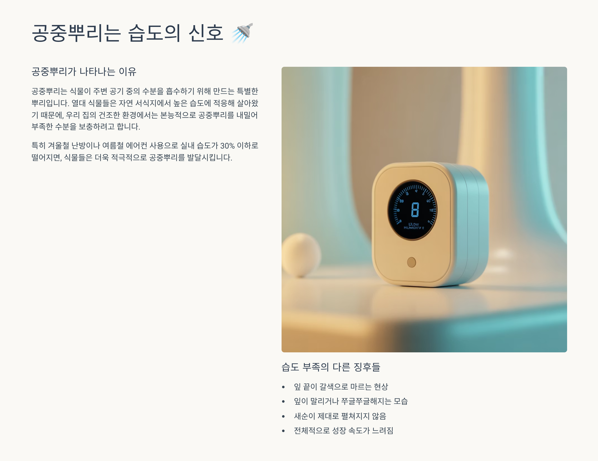 | 실내 습도 | 식물 반응 | 공중뿌리 발생 가능성 |