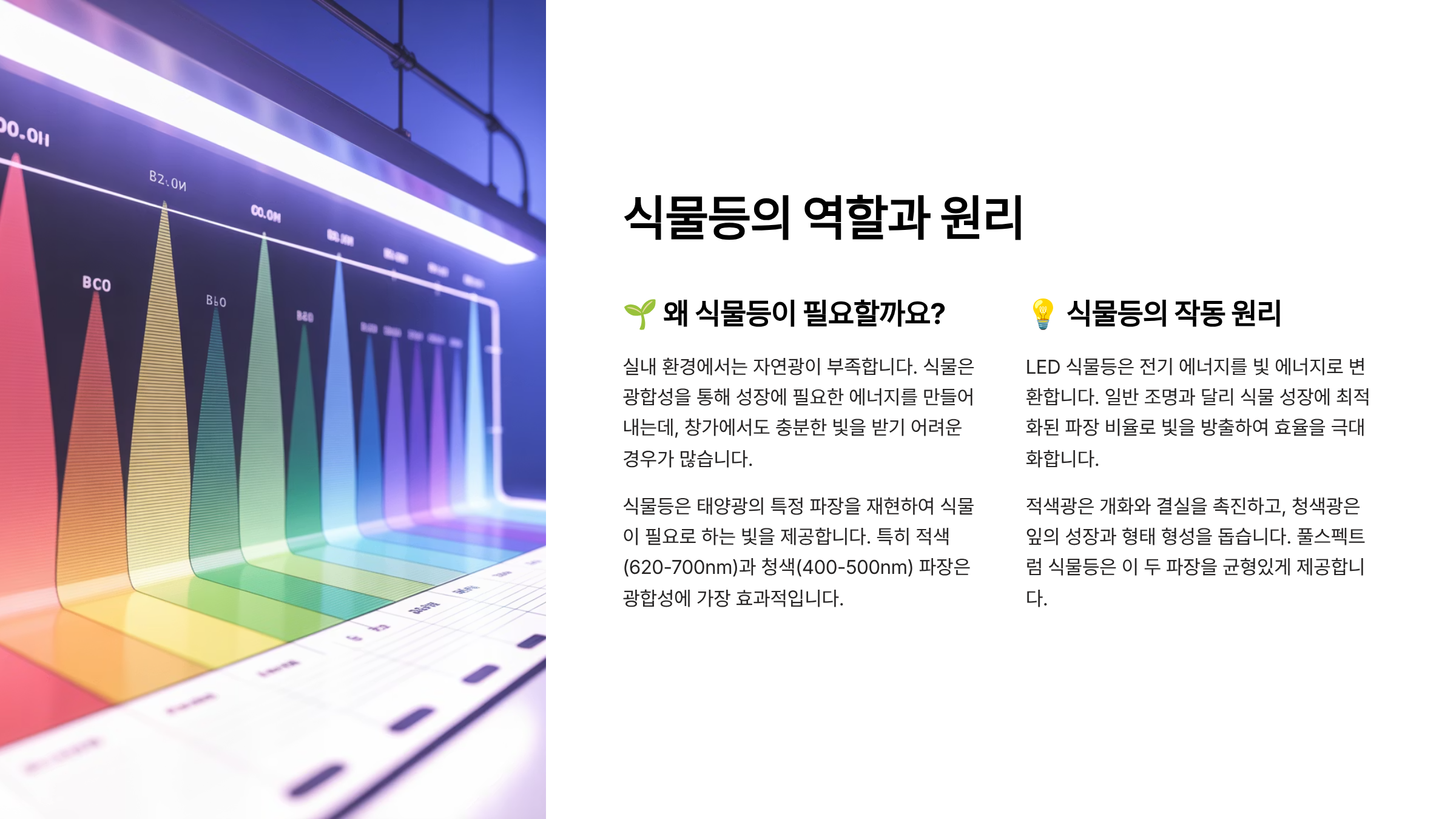 식물등이 효과적인 이유는 ‘광합성 유효 광량자속밀도(PPFD)’를 조절할 수 있기 때문이에요. 빛의 파장 중에서도 식물은 주로 청색광(약 450nm)과 적색광(약 660nm)을 필요로 해요. 이 두 파장이 균형을 이루면 잎이 무성해지고 꽃도 잘 피우게 되죠. 실제로 LED 제조사들은 이 두 파장을 중심으로 스펙을 설계하고 있어요.