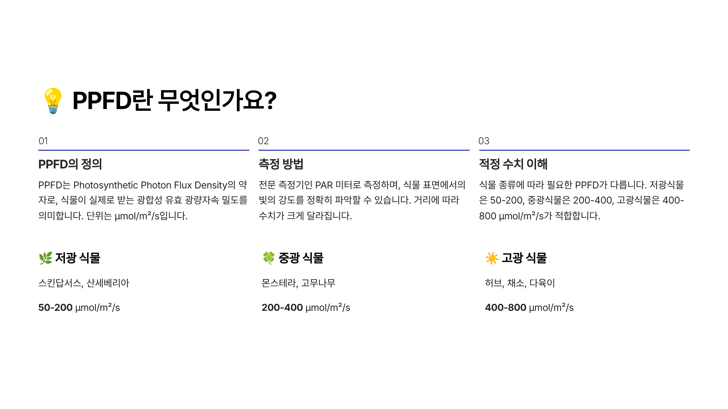 PPFD는 "Photosynthetic Photon Flux Density"의 약자로, 식물광합성에 필요한 광자 수치를 의미해요. 단위는 µmol/m²/s로 표기되며, 이는 1초 동안 1㎡의 면적에 도달하는 광합성 유효광자의 수를 나타내요. 쉽게 말하면, 식물이 실제로 받아들이는 빛의 강도인 셈이에요.