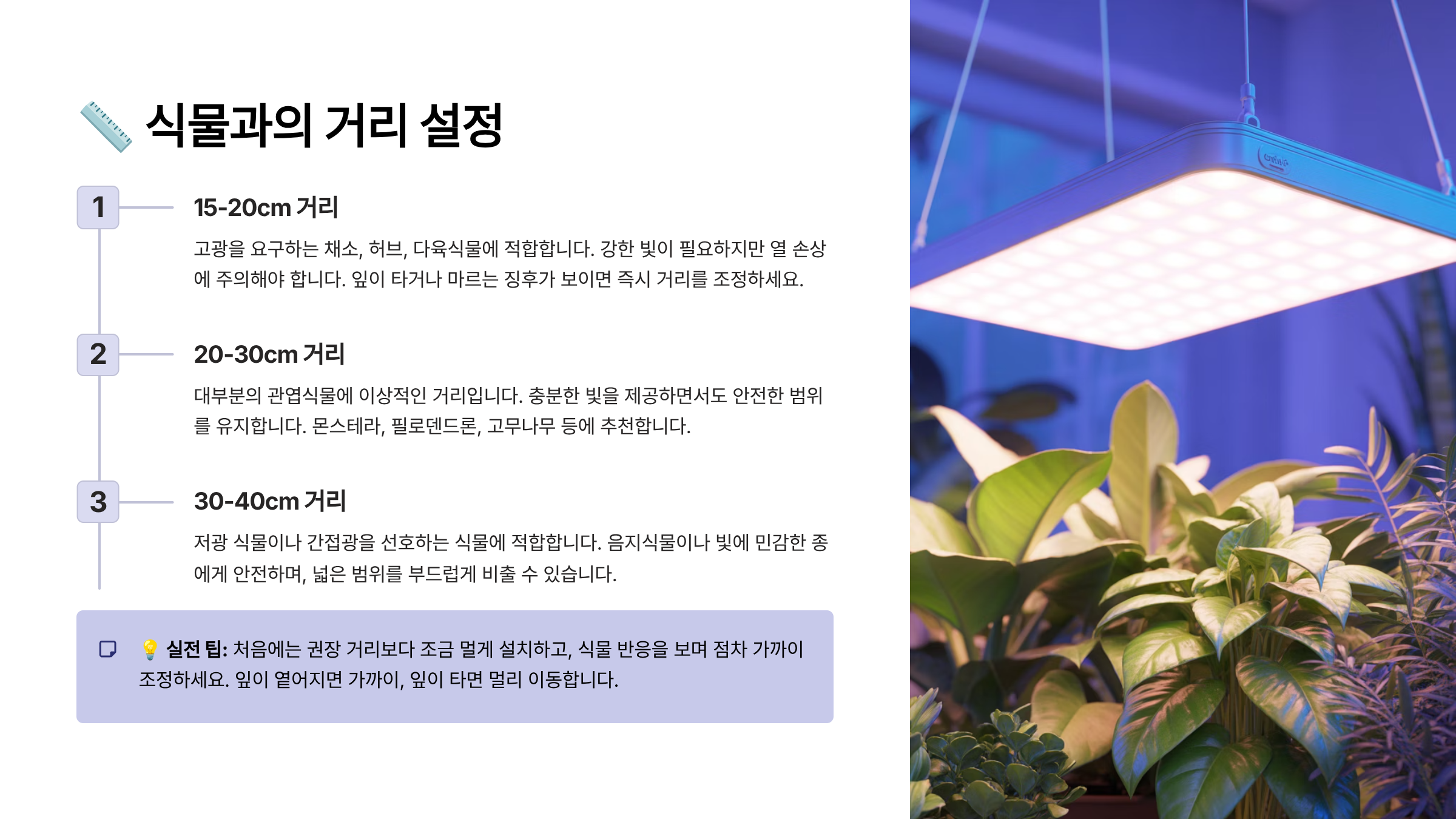 보통 20~30cm 거리가 이상적이에요. 이 거리는 대부분의 중소형 LED 식물등이 충분한 PPFD를 제공할 수 있는 거리예요. 더 가까이 설치하면 빛은 강해지지만 열도 증가하니까, 식물이 탈 수 있으니 주의해야 해요. 특히 어린잎이나 새순은 열에 민감하답니다.