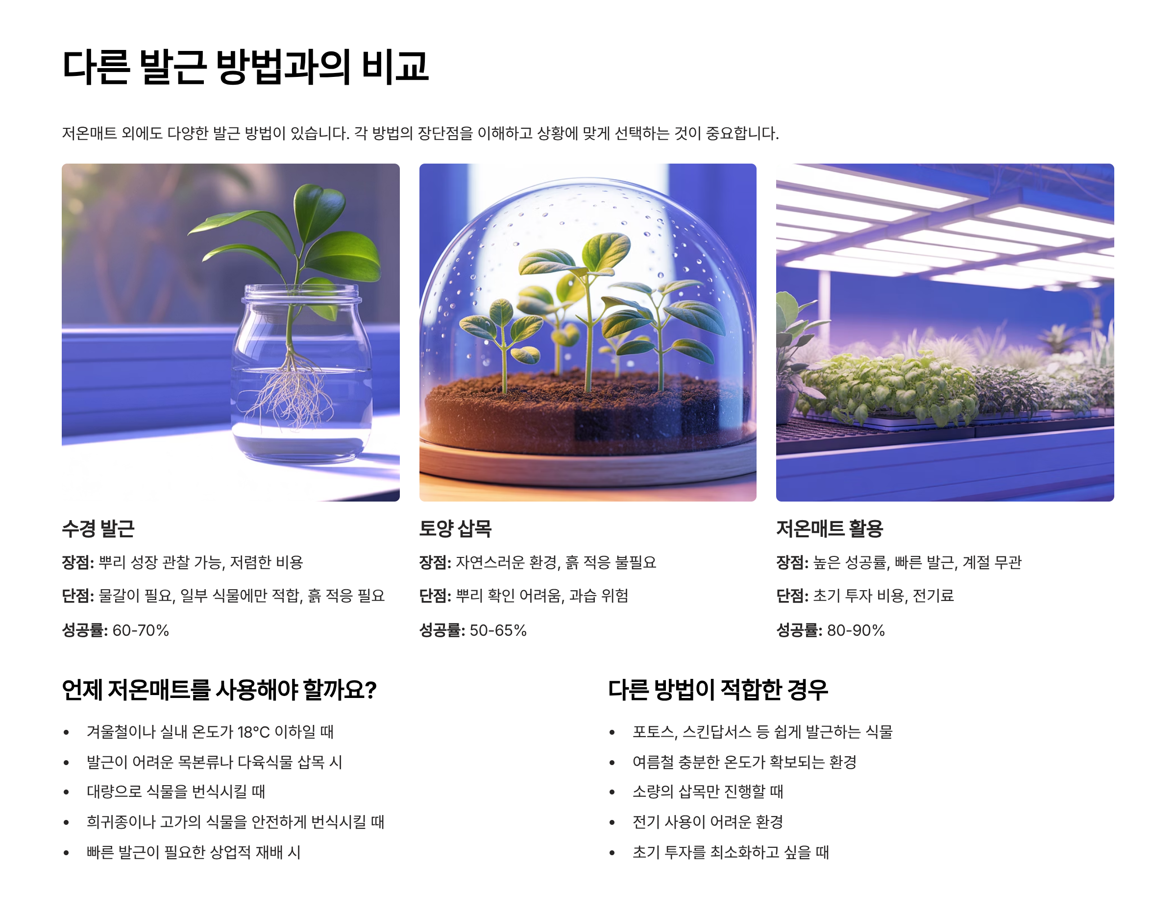 이처럼 발근 방법에는 각각의 특성이 있어요. 저온매트는 특히 실패율을 줄이고, 초보자도 쉽게 온도 관리를 통해 성공적인 발근을 이끌어낼 수 있기 때문에 최근 들어 가장 각광받는 방법이에요. 고급 식물이나 희귀 식물의 번식에도 활용되고 있어요. 🌿✨