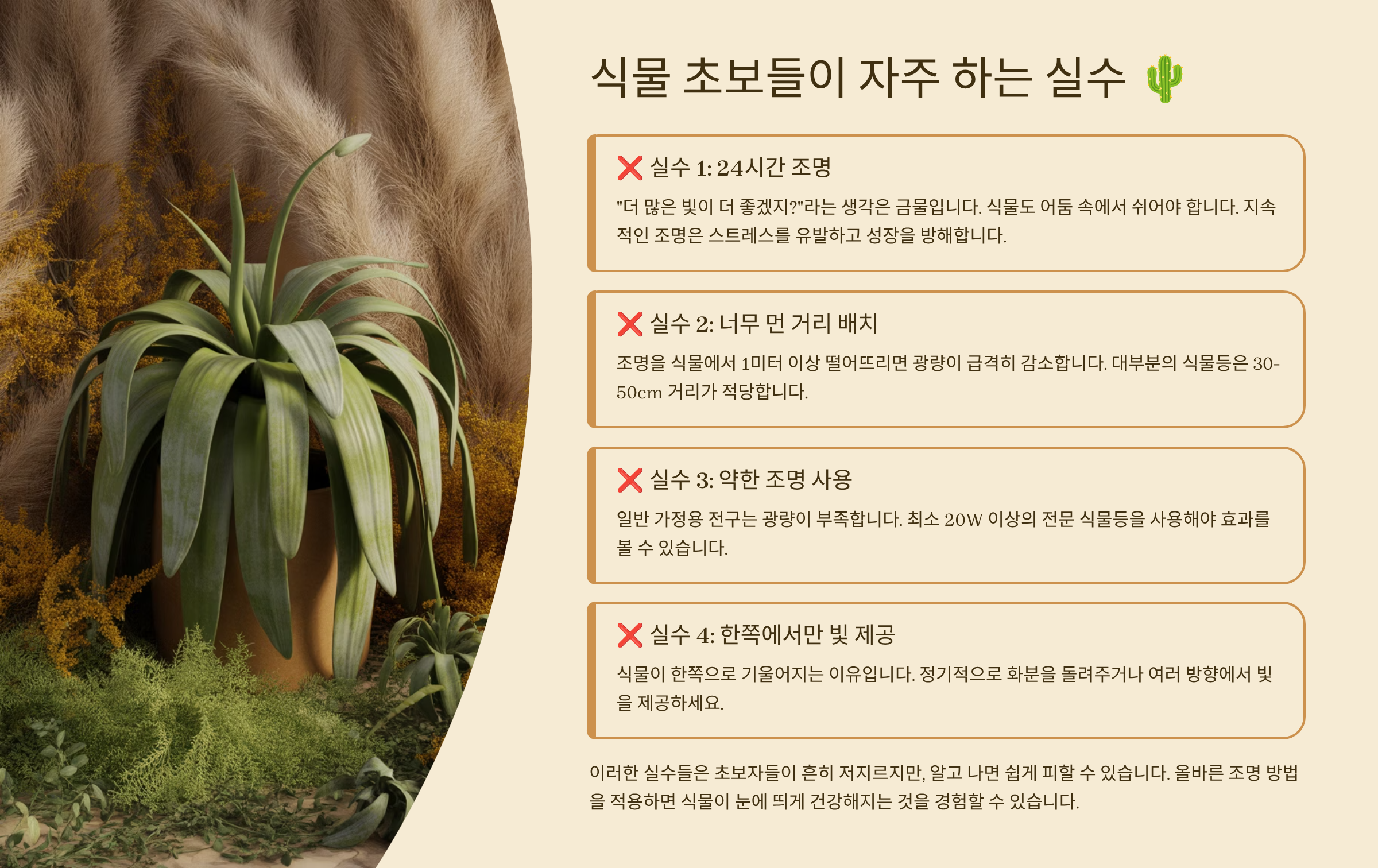 조명 시간만 제대로 맞춰줘도 식물 건강은 눈에 띄게 달라져요. 다음은 식물 초보들이 자주 하는 실수들을 정리해드릴게요. 혹시 나도 그랬나? 체크해보세요! 🔍