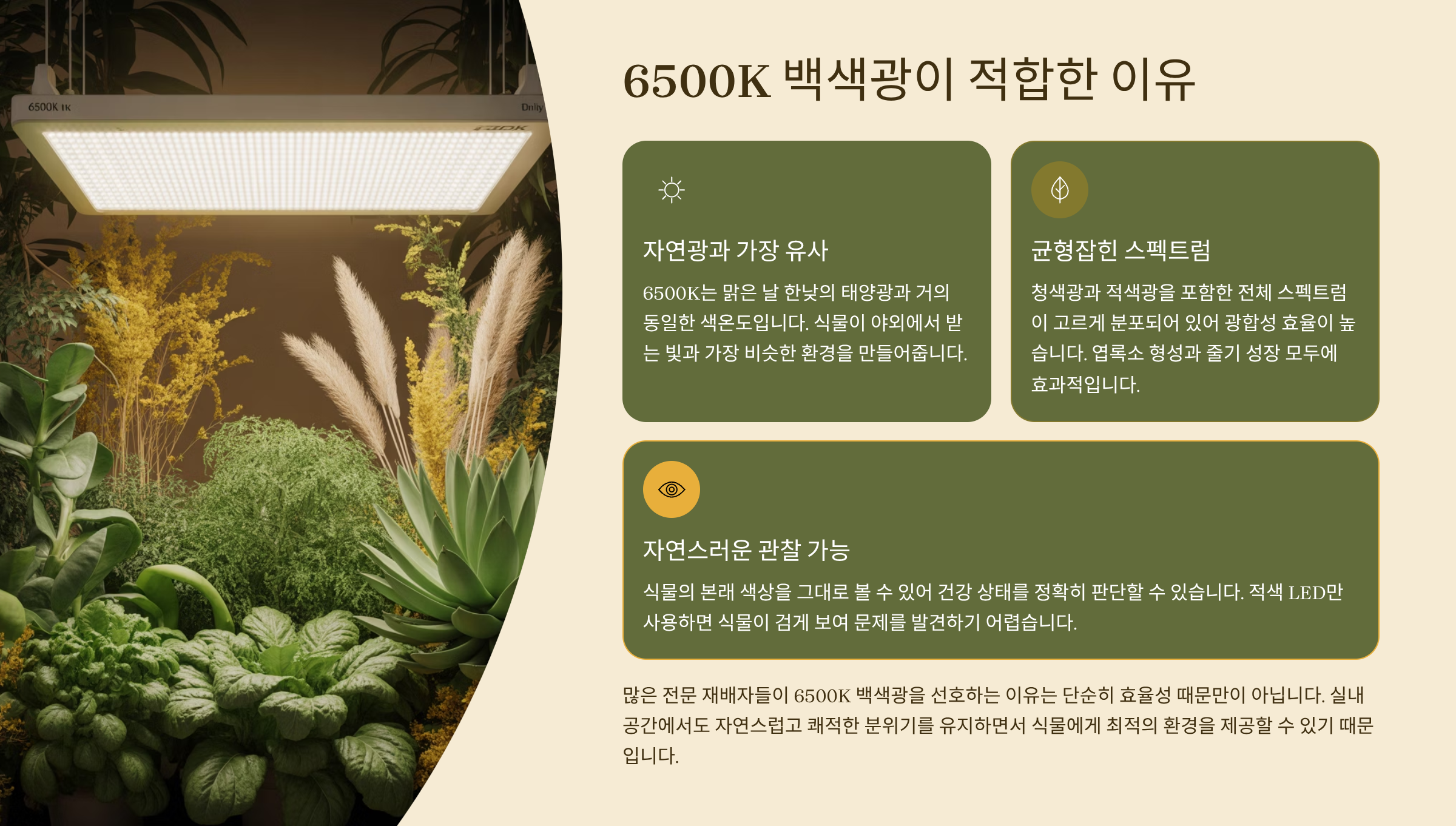 결론적으로 식물에게는 단순히 ‘밝은’ 조명보다 ‘적절한 색온도와 파장을 가진’ 조명이 필요하다는 걸 알 수 있어요. 여기에 딱 맞는 게 바로 6500K 백색광이에요.