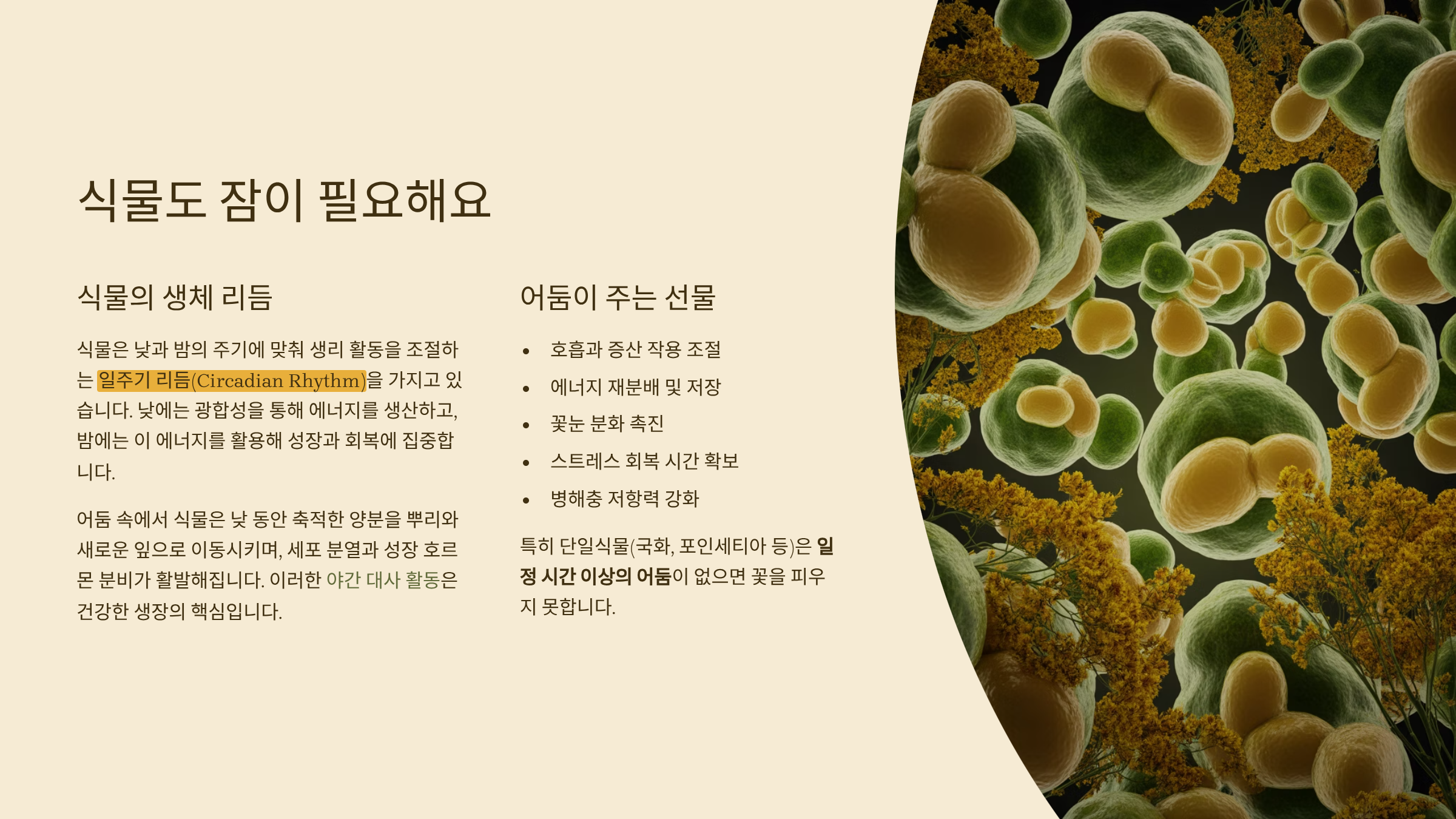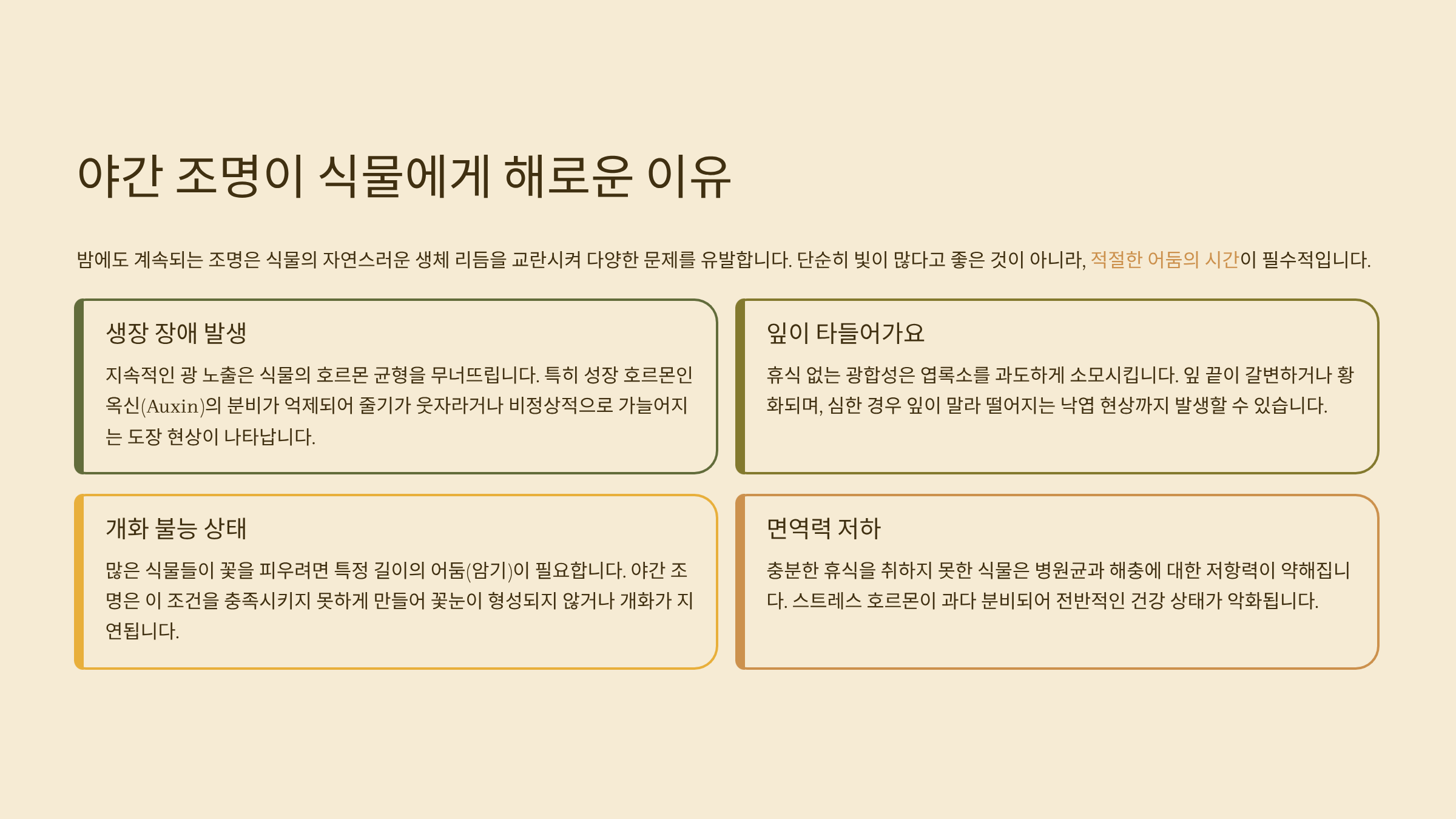 실제로 식물은 빛의 유무에 따라 리듬을 조절해요. 이를 ‘일주기 리듬’ 또는 ‘서캐디언 리듬’이라고 부르는데, 이 리듬이 무너지면 생장이 늦어지고 면역력이 떨어질 수 있어요. 특히 실내 식물은 야간 인공조명 때문에 생체 리듬이 깨지기 쉬워요.