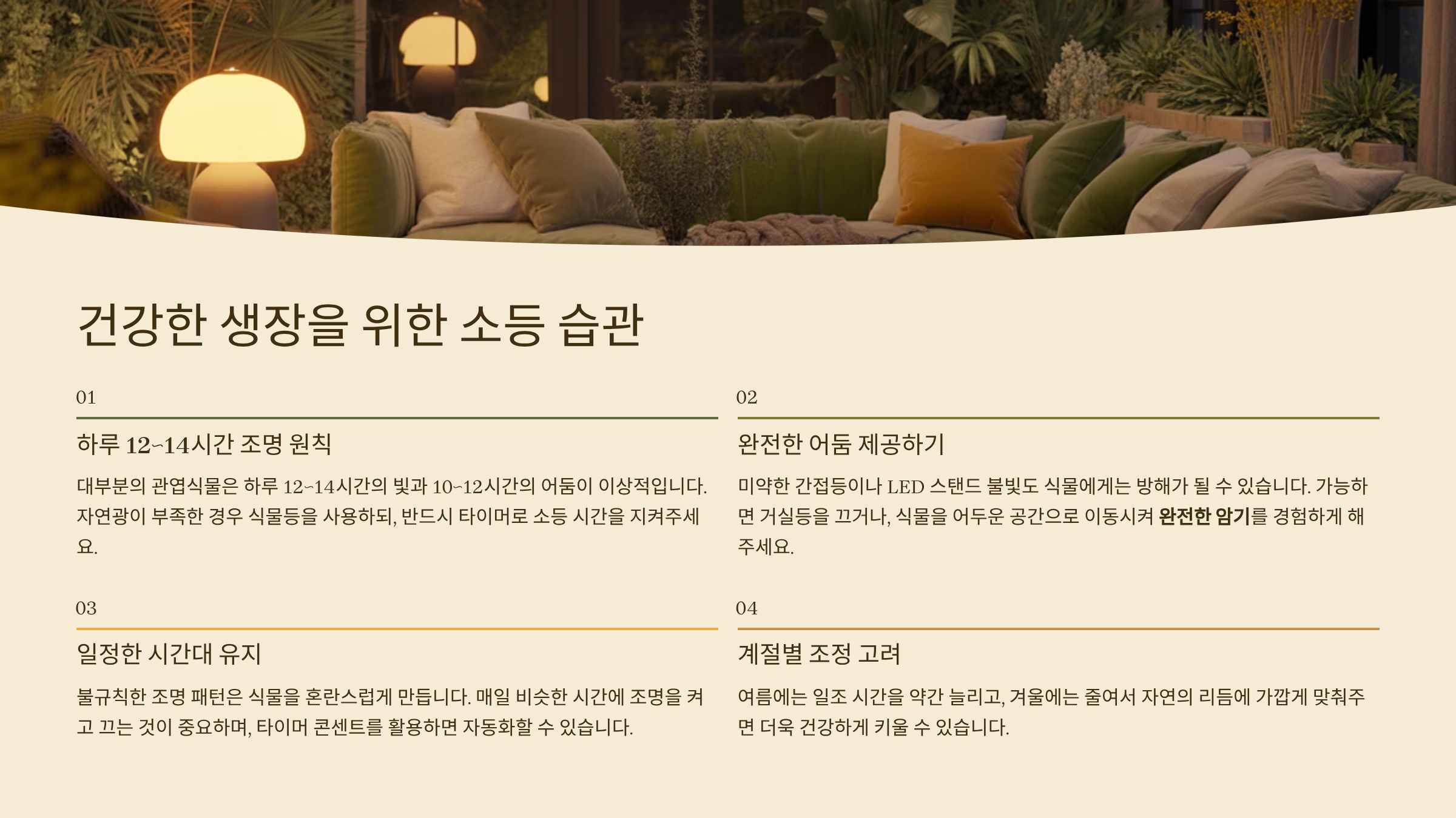 5. 식물에 맞는 수면 시간도 확인해보는 게 중요해요. 일부 식물은 12시간 이상의 암흑이 필요한 종류도 있으니, 키우는 식물에 맞춘 리듬을 적용해보세요!