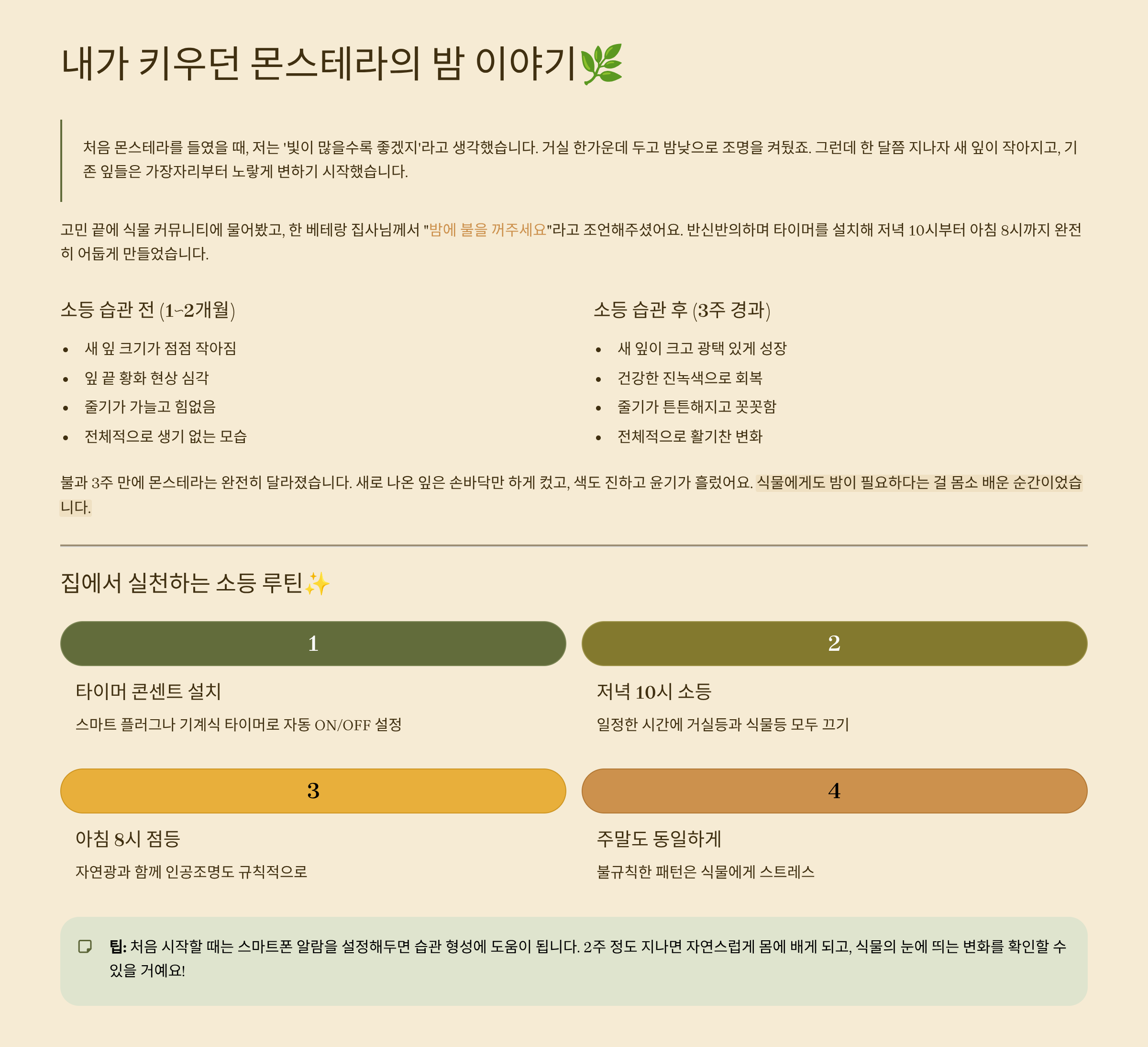 이제부터 식물의 밤을 위해 완전 소등을 실천하는 방법을 알아볼게요. 이 내용은 식물의 생리학, 환경적 요소, 나의 경험까지 포함해서 준비했어요. 읽으면서 ‘나도 이렇게 해봐야겠다!’ 싶은 부분이 생길지도 몰라요 😊