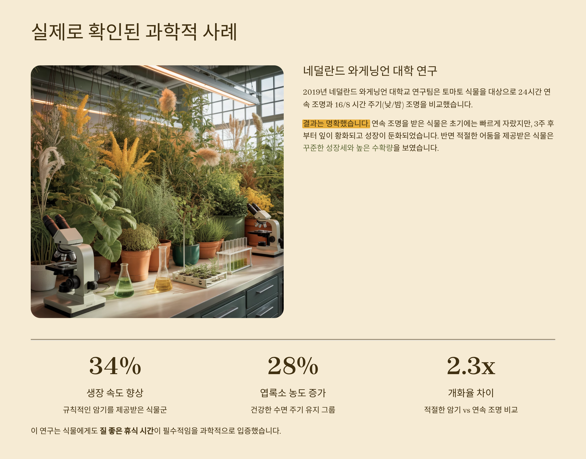 실제로 식물은 빛의 유무에 따라 리듬을 조절해요. 이를 ‘일주기 리듬’ 또는 ‘서캐디언 리듬’이라고 부르는데, 이 리듬이 무너지면 생장이 늦어지고 면역력이 떨어질 수 있어요. 특히 실내 식물은 야간 인공조명 때문에 생체 리듬이 깨지기 쉬워요.