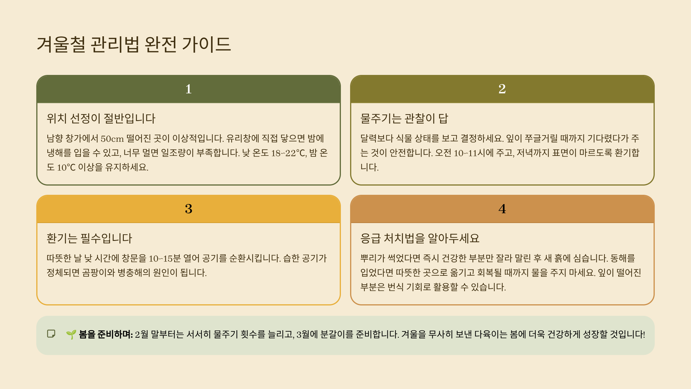 이제 어떤 품종이 겨울철에 어떤 반응을 보이는지 알았으니, ‘그럼 어떤 실수들이 문제를 일으키는지’에 대해 이어서 확인해볼게요! 👇