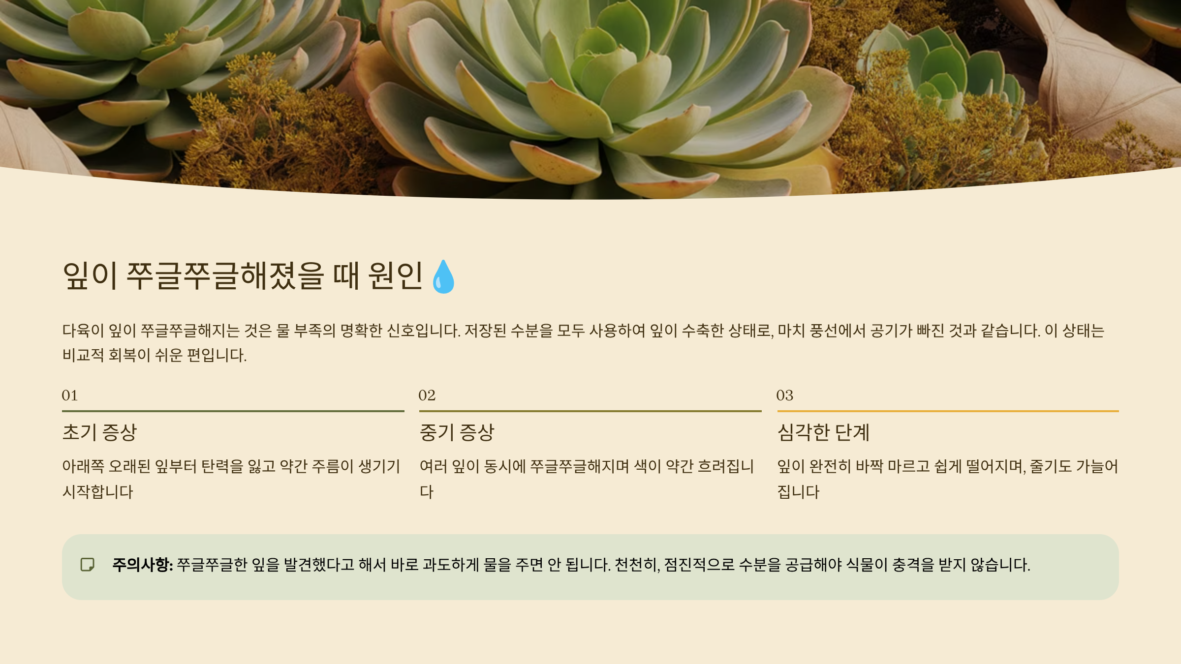 다음으로는 다육이 잎이 축축하고 물러졌을 때, 즉 과습일 때 나타나는 증상을 다뤄볼게요! 💧