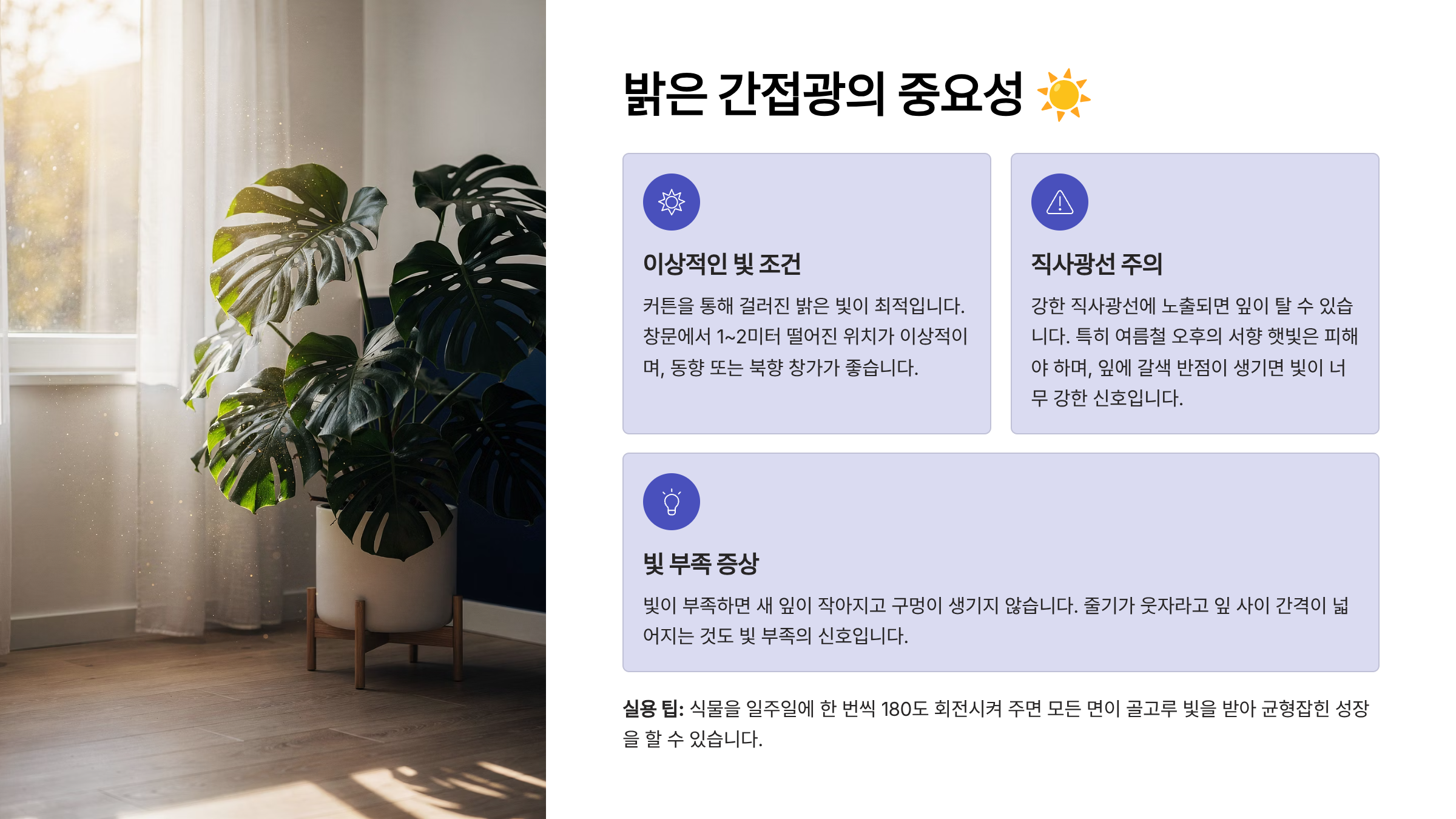 실내 플랜테리어에 관심 있는 분들이라면 이 밝은 간접광 조건을 이해하는 것만으로도, 식물의 건강은 물론 인테리어 효과도 극대화할 수 있어요. 햇빛은 몬스테라에게 단순한 에너지가 아니라 생명줄 같은 존재니까요 🌞