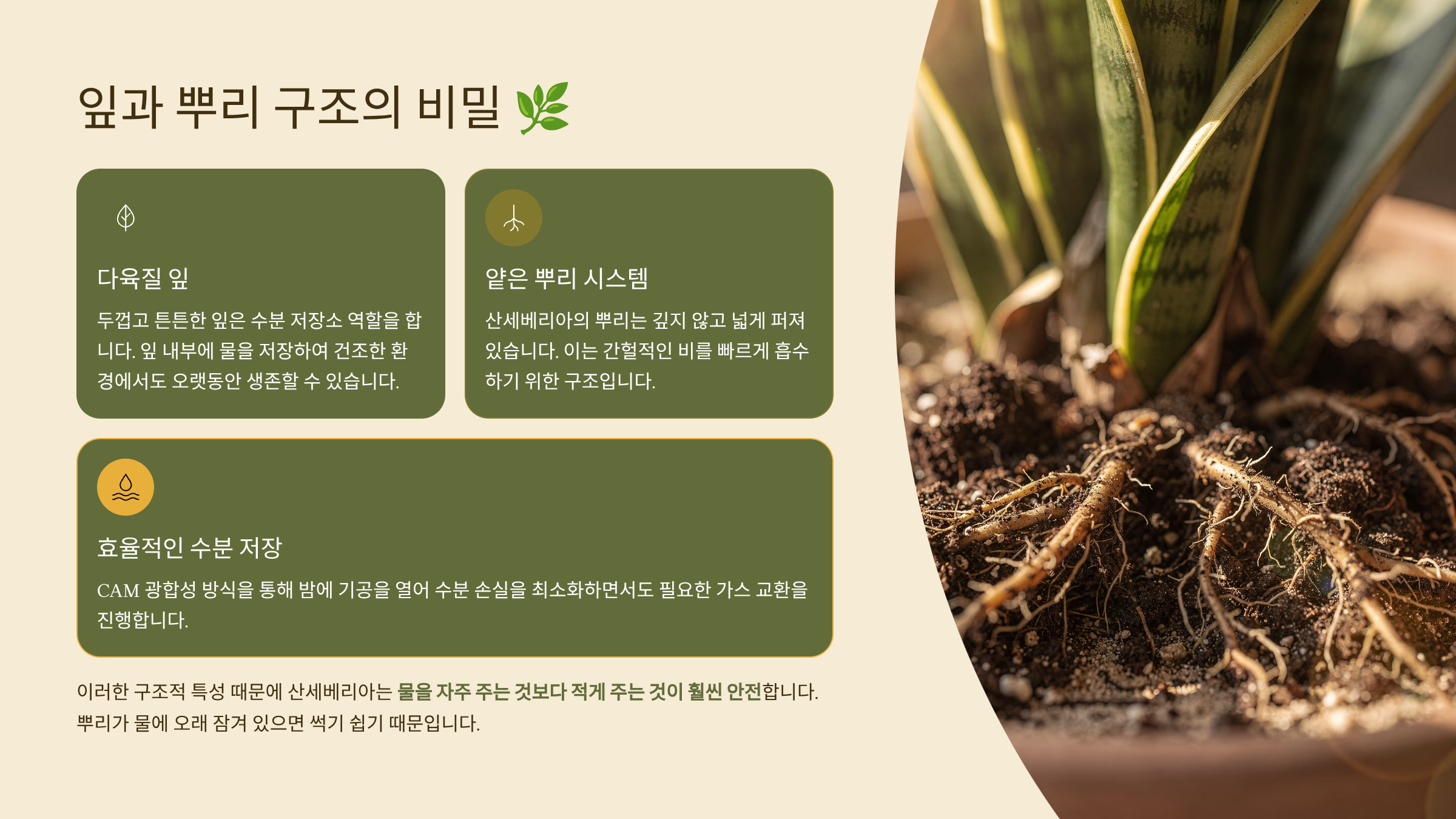 이런 구조 덕분에 산세베리아는 오랜 기간 물 없이도 건강하게 자랄 수 있어요. 물을 주지 않아도 되는 게 아니라, 오히려 과한 물이 문제를 만들 수 있다는 거죠.
