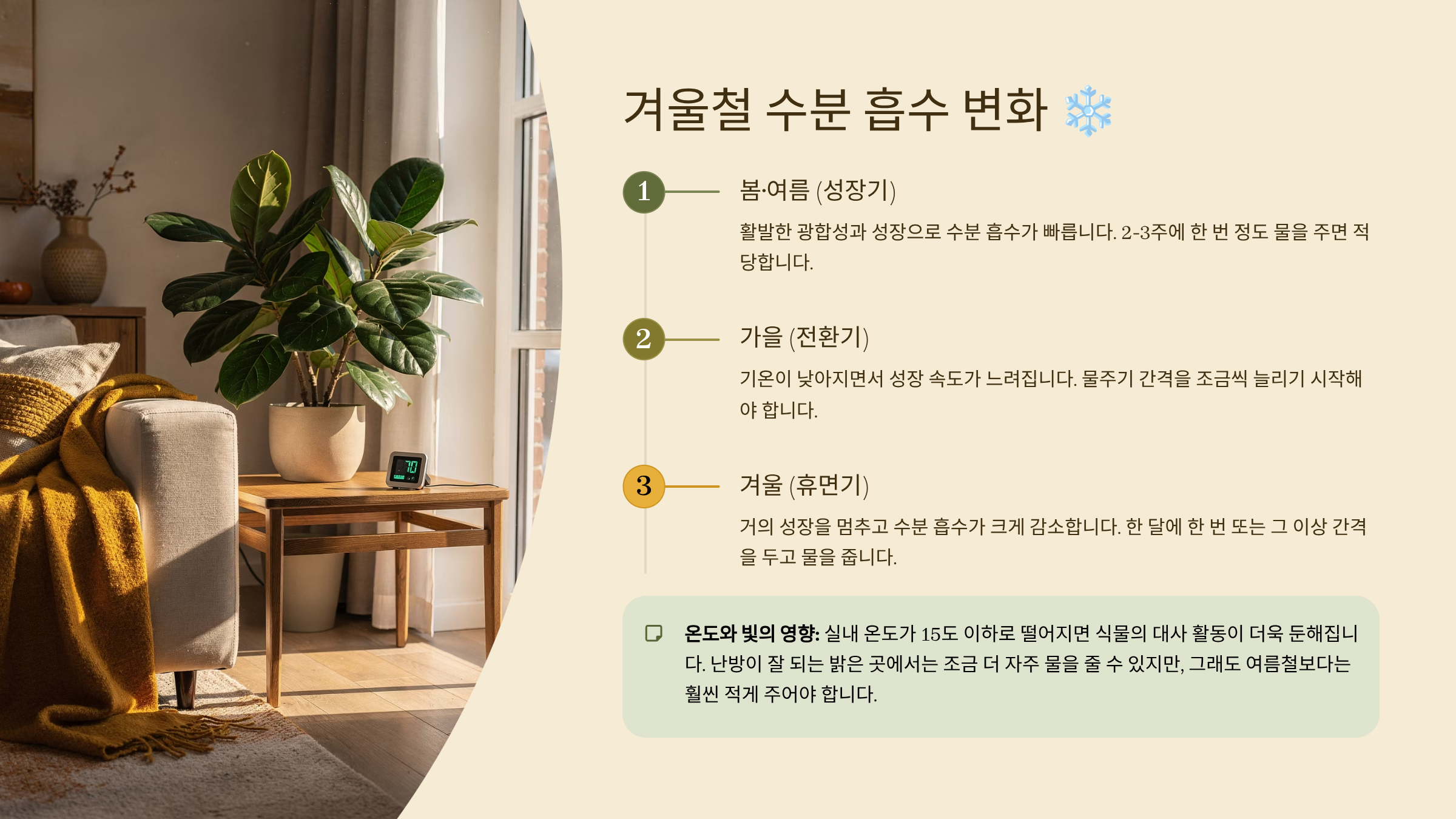 기온이 낮으면 흙 속의 수분이 잘 마르지 않아요. 실내가 건조하다고 해도, 식물 자체가 물을 빨아들이지 않기 때문에 물은 그대로 남아 있게 되죠. 이 남은 물이 문제를 만들어요. 😨