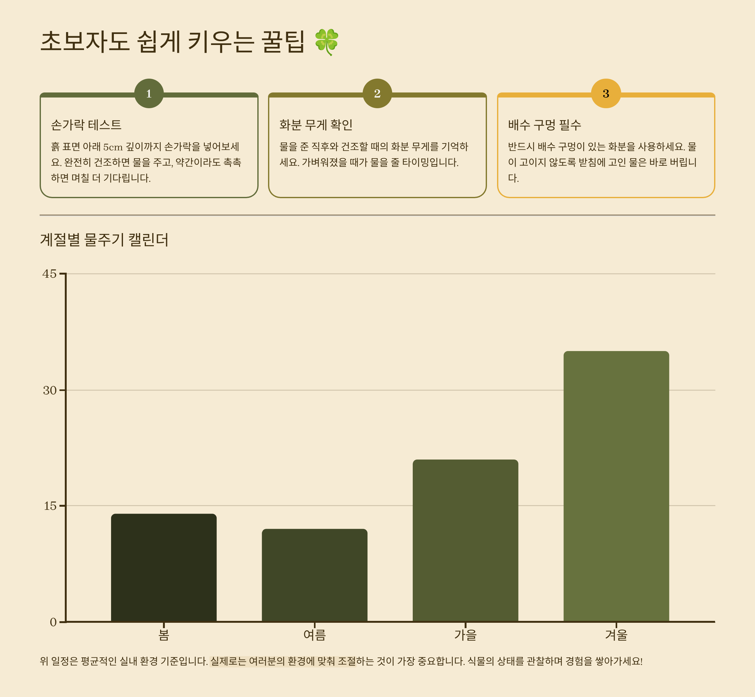 | 겨울 | 4주 1회 | 흙 상태 체크 후 필요할 때만 |