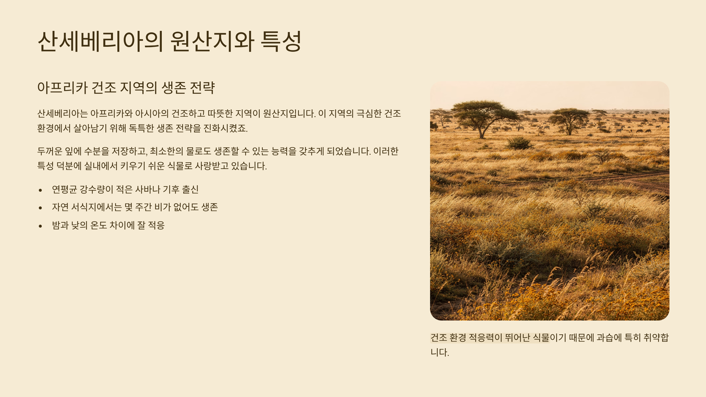 산세베리아는 아프리카 대륙의 열대 건조지대에서 유래한 식물이에요. 특히 나이지리아, 콩고, 케냐 같은 지역에서 자생하던 이 식물은 건조한 환경에서도 꿋꿋하게 살아남을 수 있도록 진화했어요. 그래서 "사막 식물"이라고 불리기도 하죠. 🌵