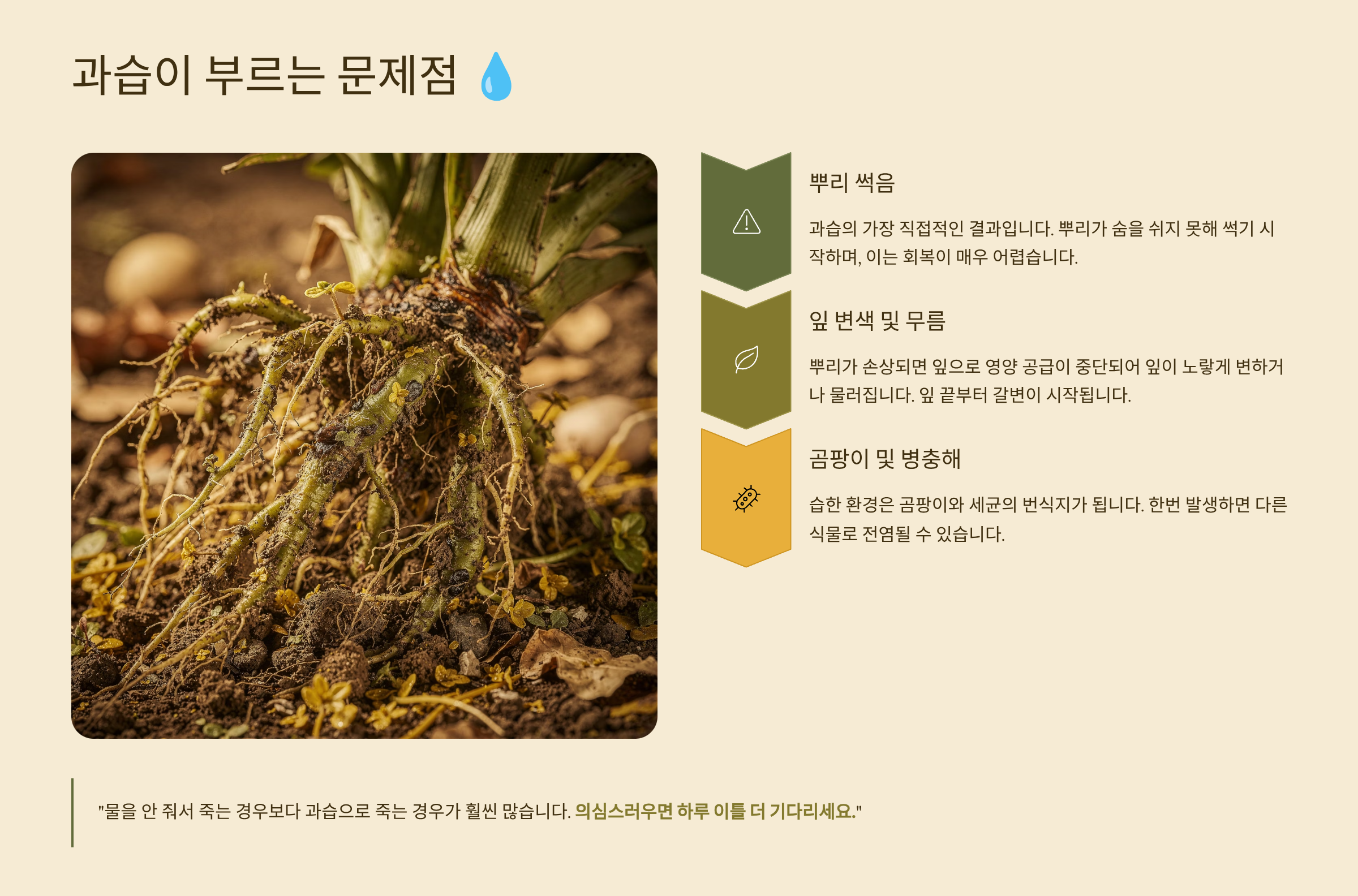 과습이 되면 가장 먼저 뿌리가 망가져요. 뿌리가 썩기 시작하면 잎으로 수분과 영양을 공급하지 못하게 되고, 결국 잎 전체가 축 늘어지며 검게 변하기도 해요. 이 상태가 되면 복구는 거의 불가능하죠. 😢