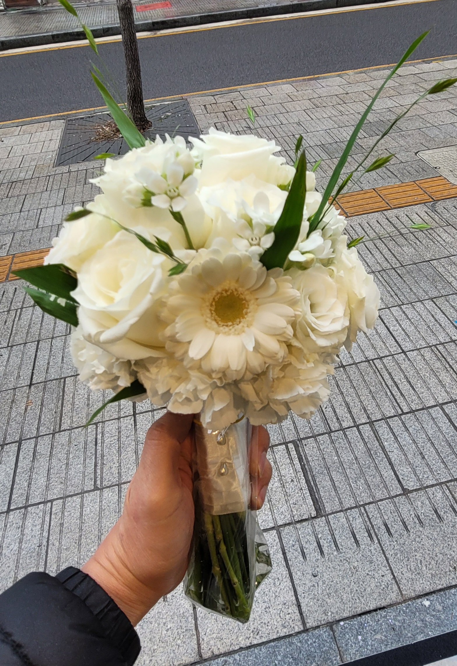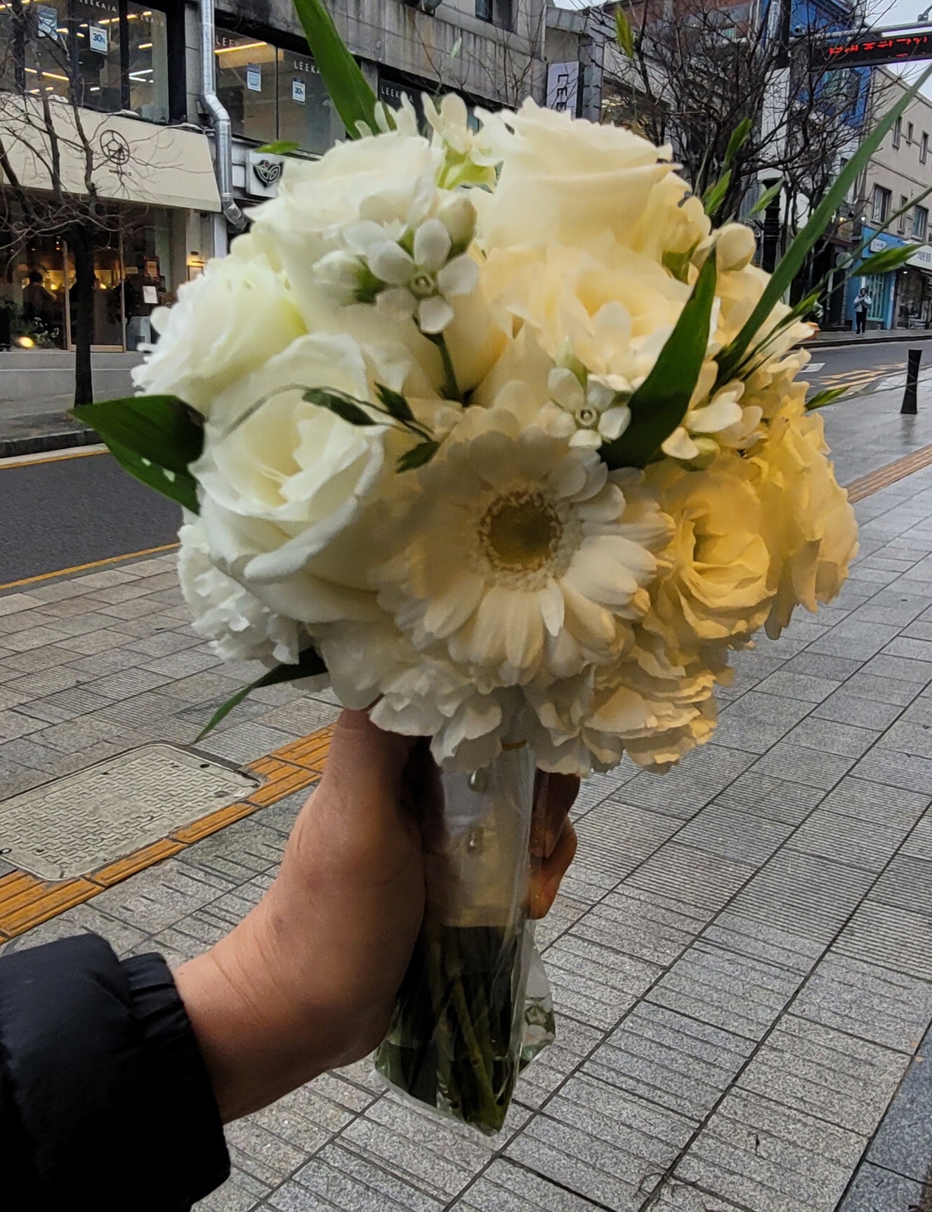 사진을 찍을 때는 부케를 턱 아래나 허리선쯤에 들고 포즈를 취하는 것이 가장 자연스럽고 예쁘게 나와요. 꽃이 너무 얼굴을 가리지 않게 조심해야 해요 😄