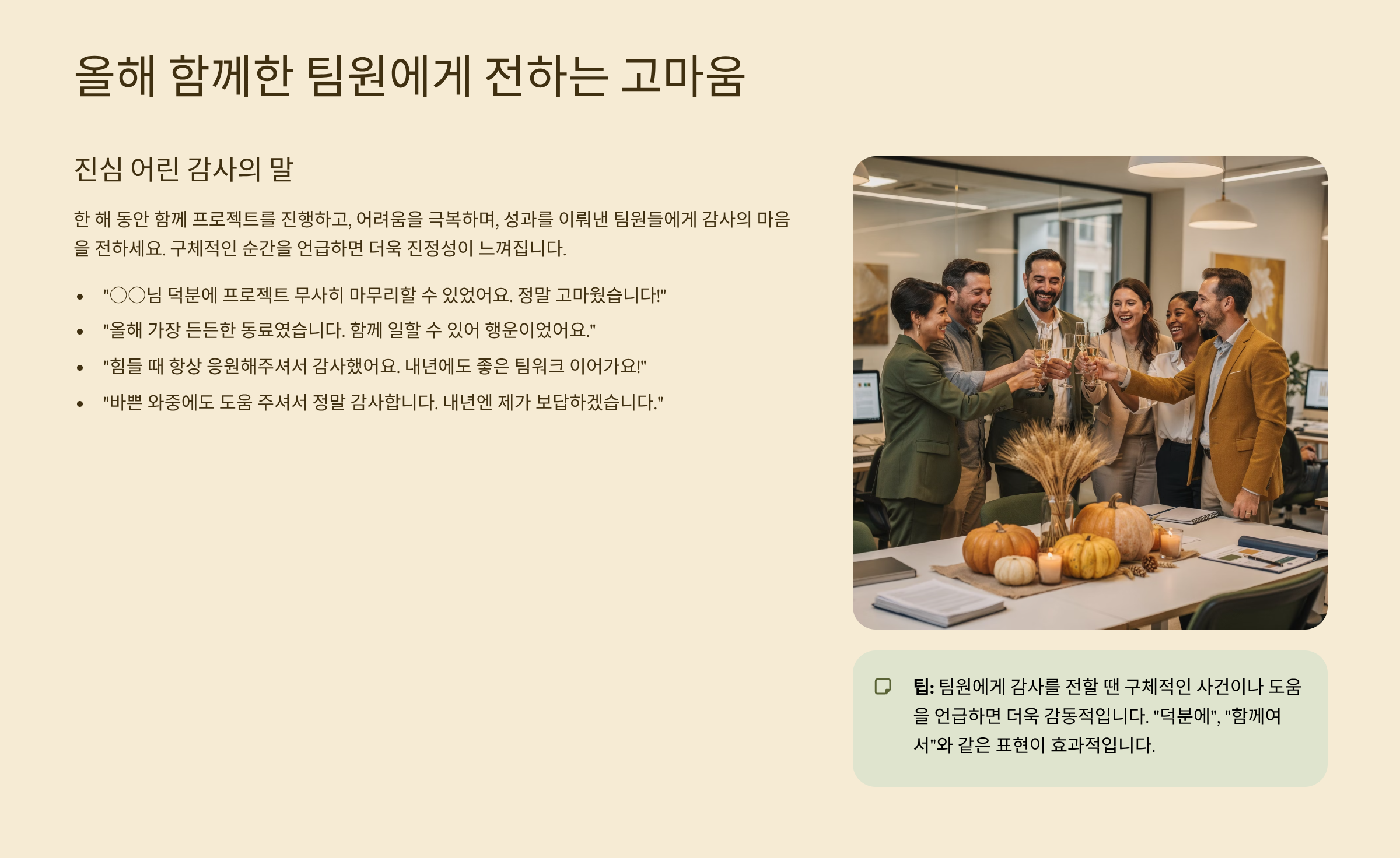 | 팀장/관리자 | "여러분 덕분에 팀이 무사히 왔어요. 내년엔 더 나은 환경 만들게요." |