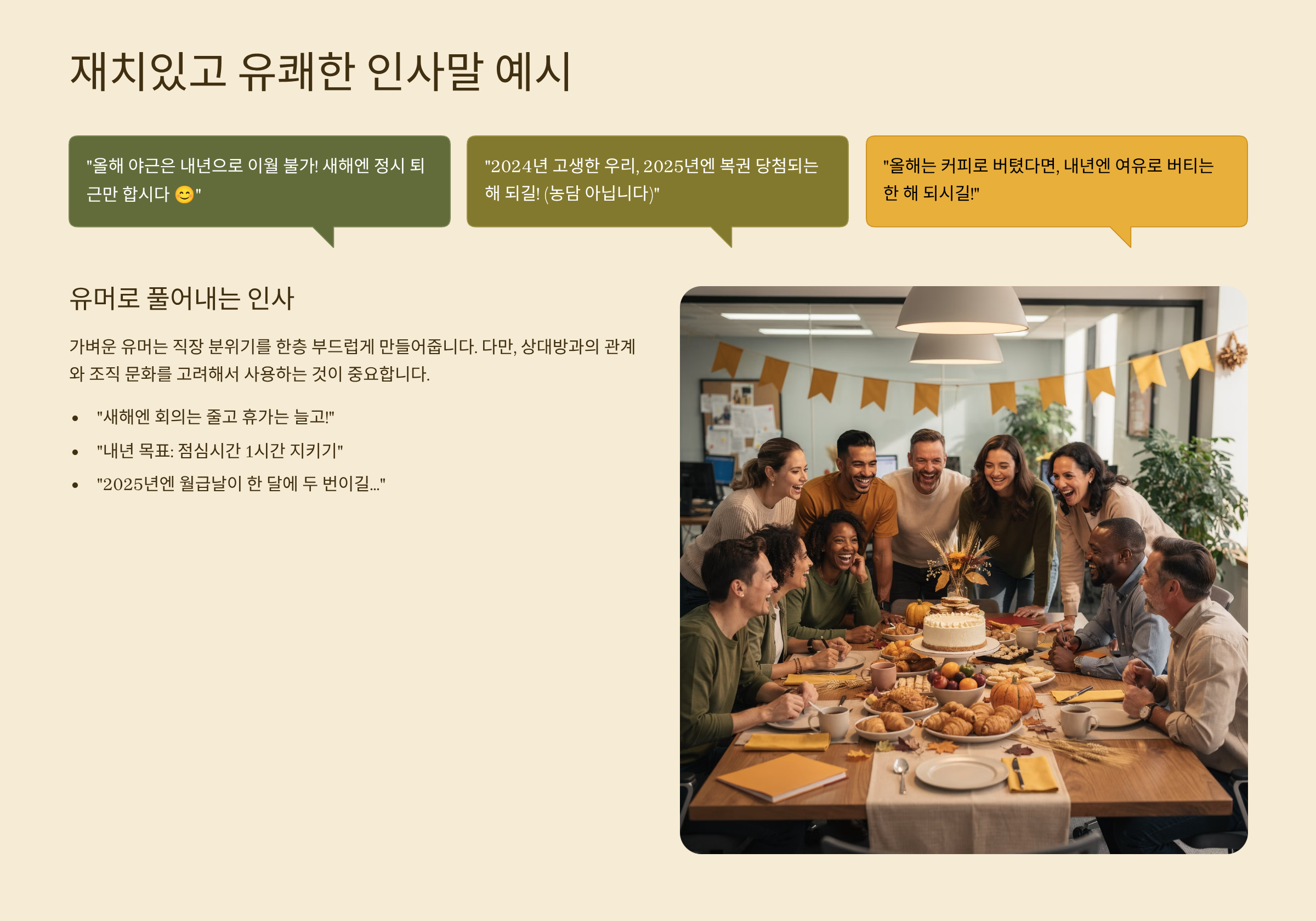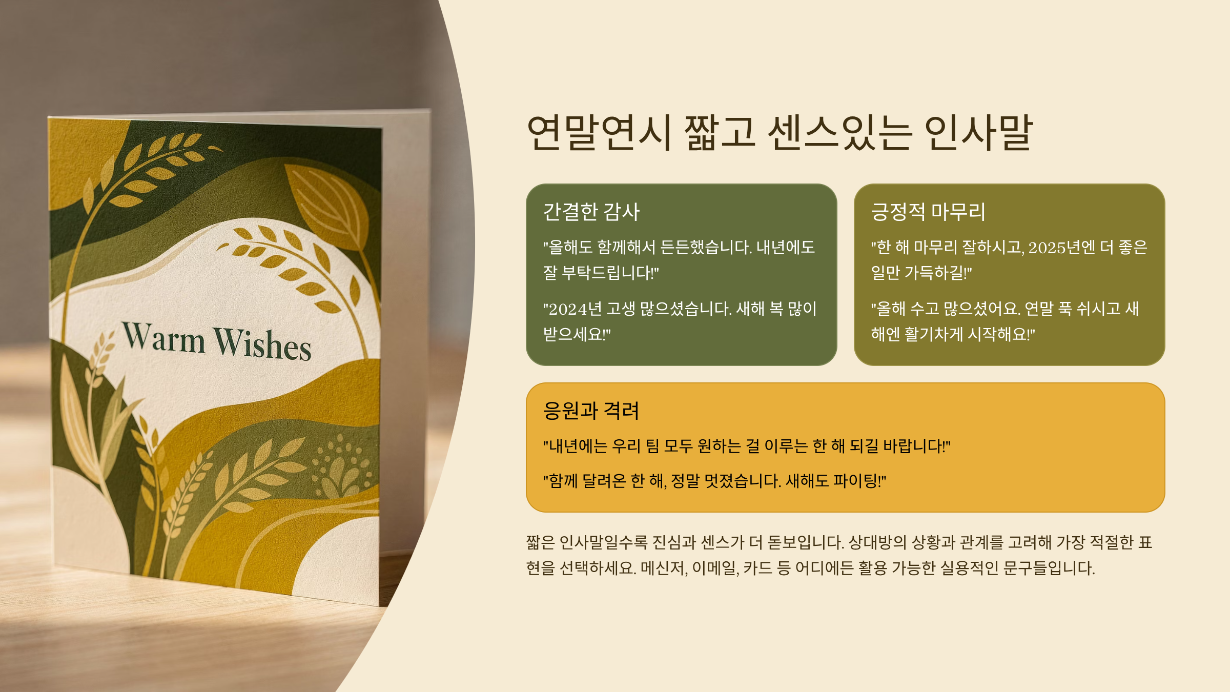 ※ 본 콘텐츠는 다양한 연말연시 인사 표현을 제안하기 위한 정보이며, 실제 상황과 사용 환경에 따라 적절하게 조정해서 활용해 주세요.