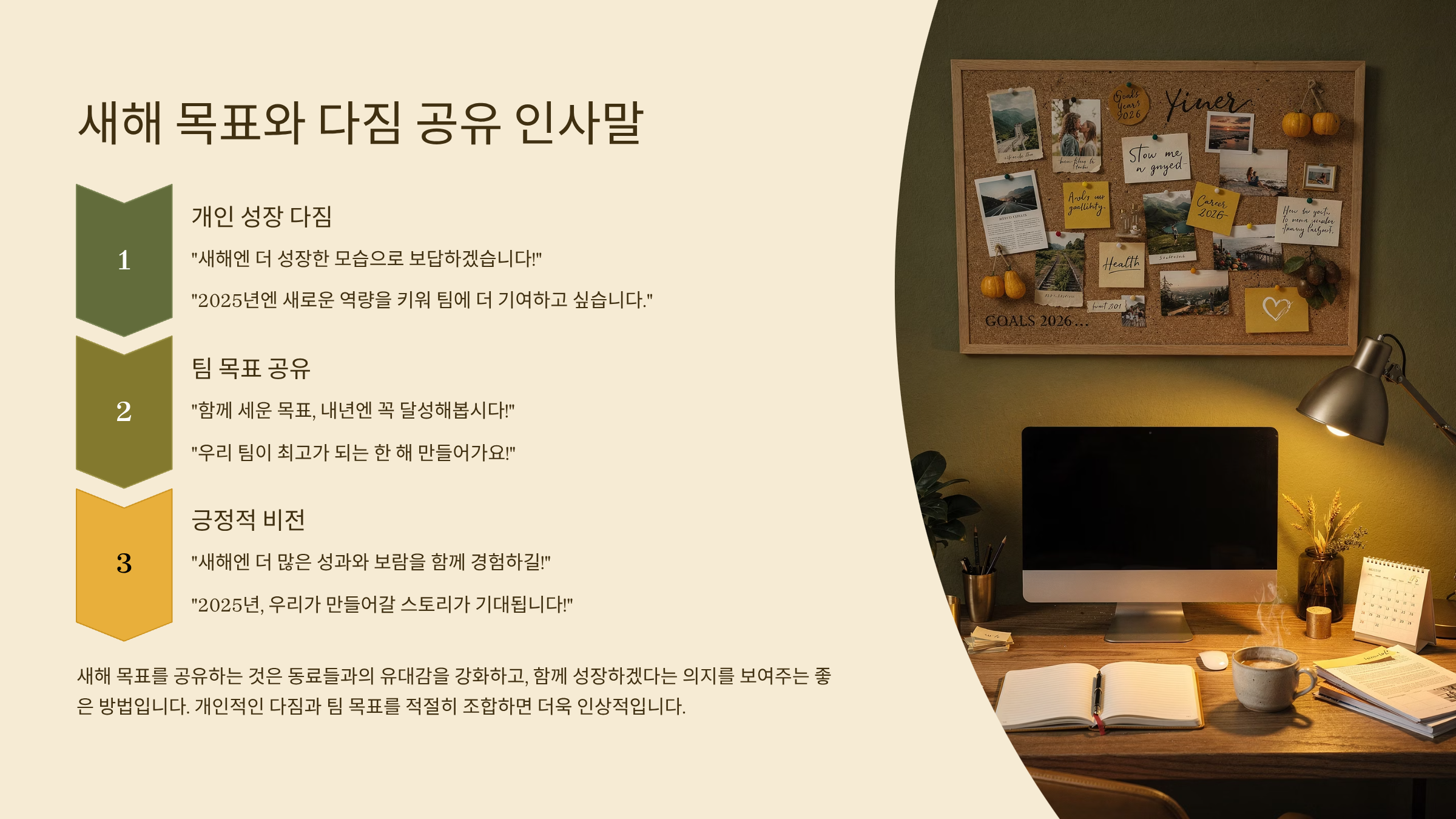 자기 다짐을 살짝 나누는 것만으로도 팀원 간 신뢰가 깊어져요. 특히 서로의 목표를 응원해주는 분위기를 만들면, 새해의 시작이 훨씬 힘차게 열려요.