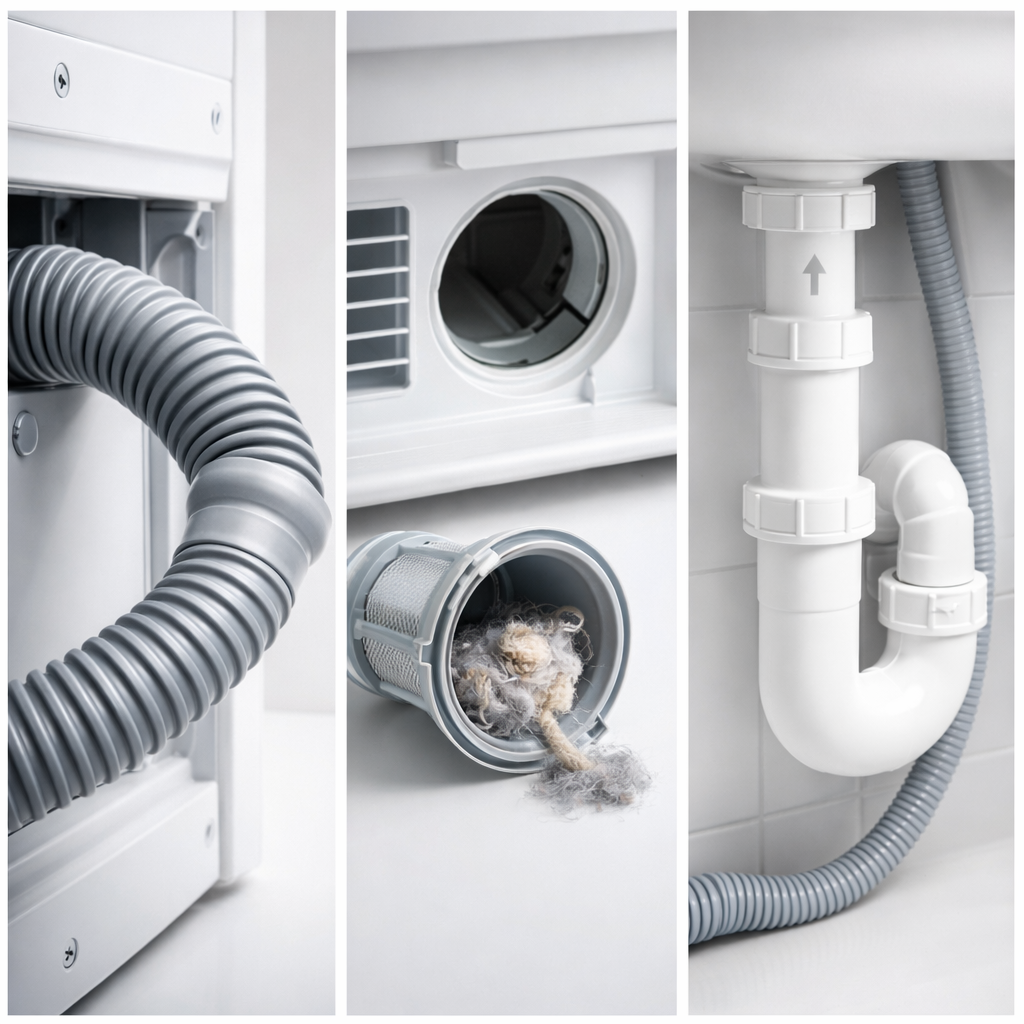 배수가 안 될 땐 가장 먼저 ‘배수 호스’를 확인해보세요. 호스가 벽이나 바닥에 눌려 있거나 심하게 꺾여 있으면 물이 빠지지 않아요. 손으로 눌림을 풀어주고, 공중에 살짝 띄우면 흐름이 훨씬 좋아져요.
