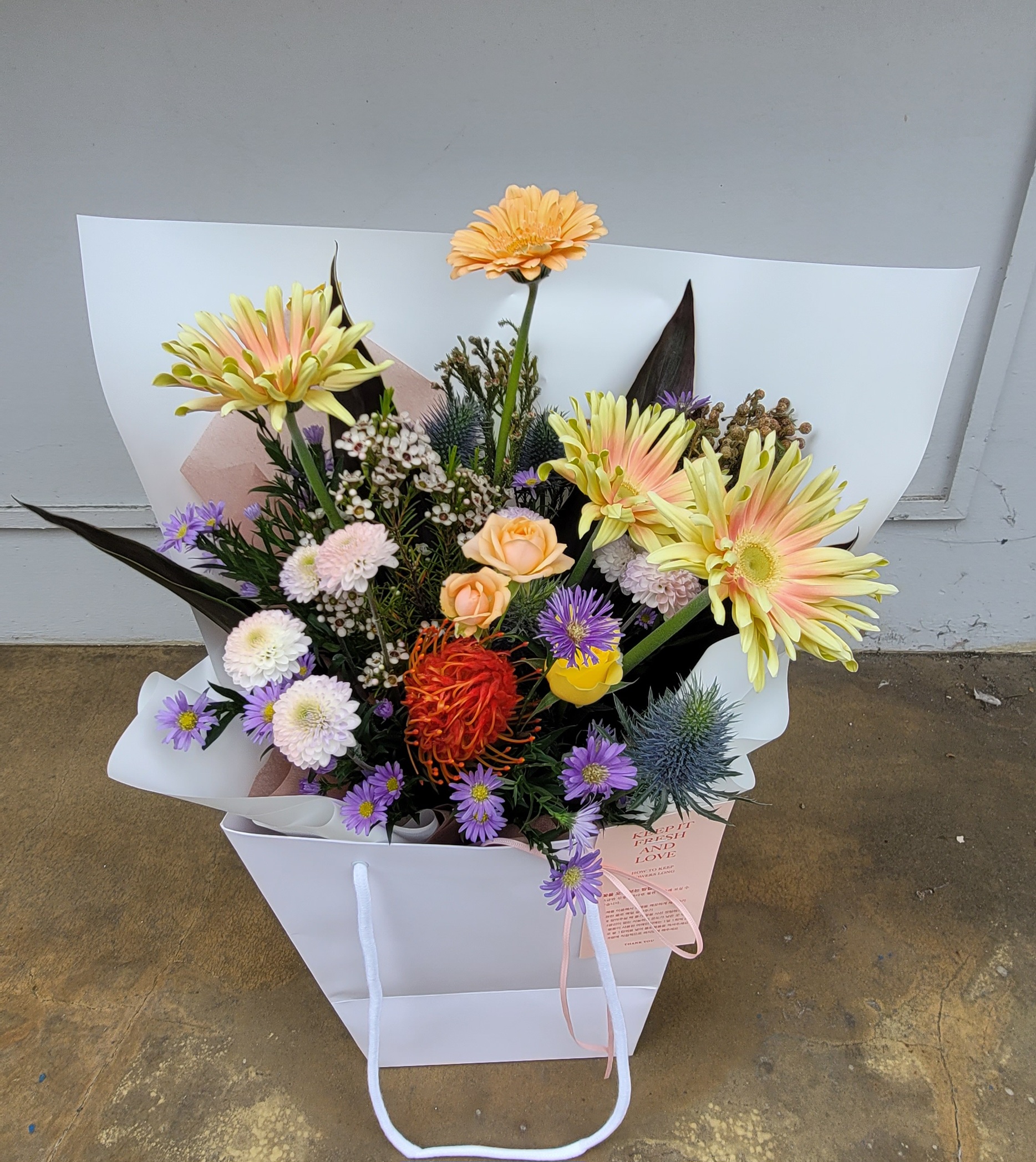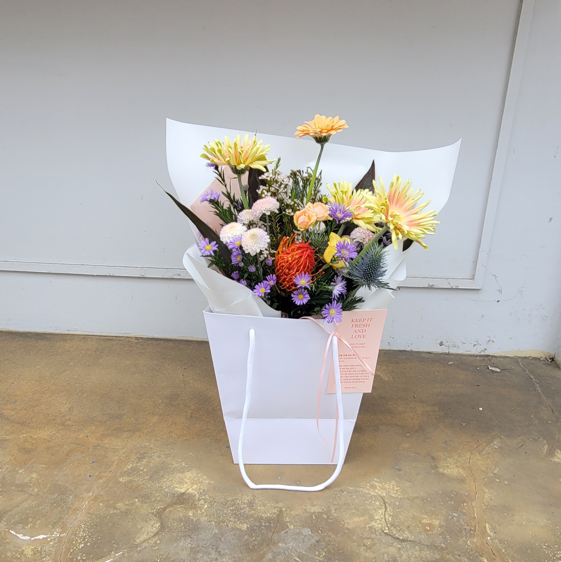 꽃의 높낮이나 부피도 고려해야 해요. 졸업식장에서 들고 다니기 편하면서도, 사진 찍었을 때 예쁘게 나오는 구성이 중요하거든요. 너무 크면 불편하고, 너무 작으면 성의 없어 보일 수 있어요. 그래서 적당한 볼륨과 안정적인 형태를 갖춘 꽃다발이 좋아요.