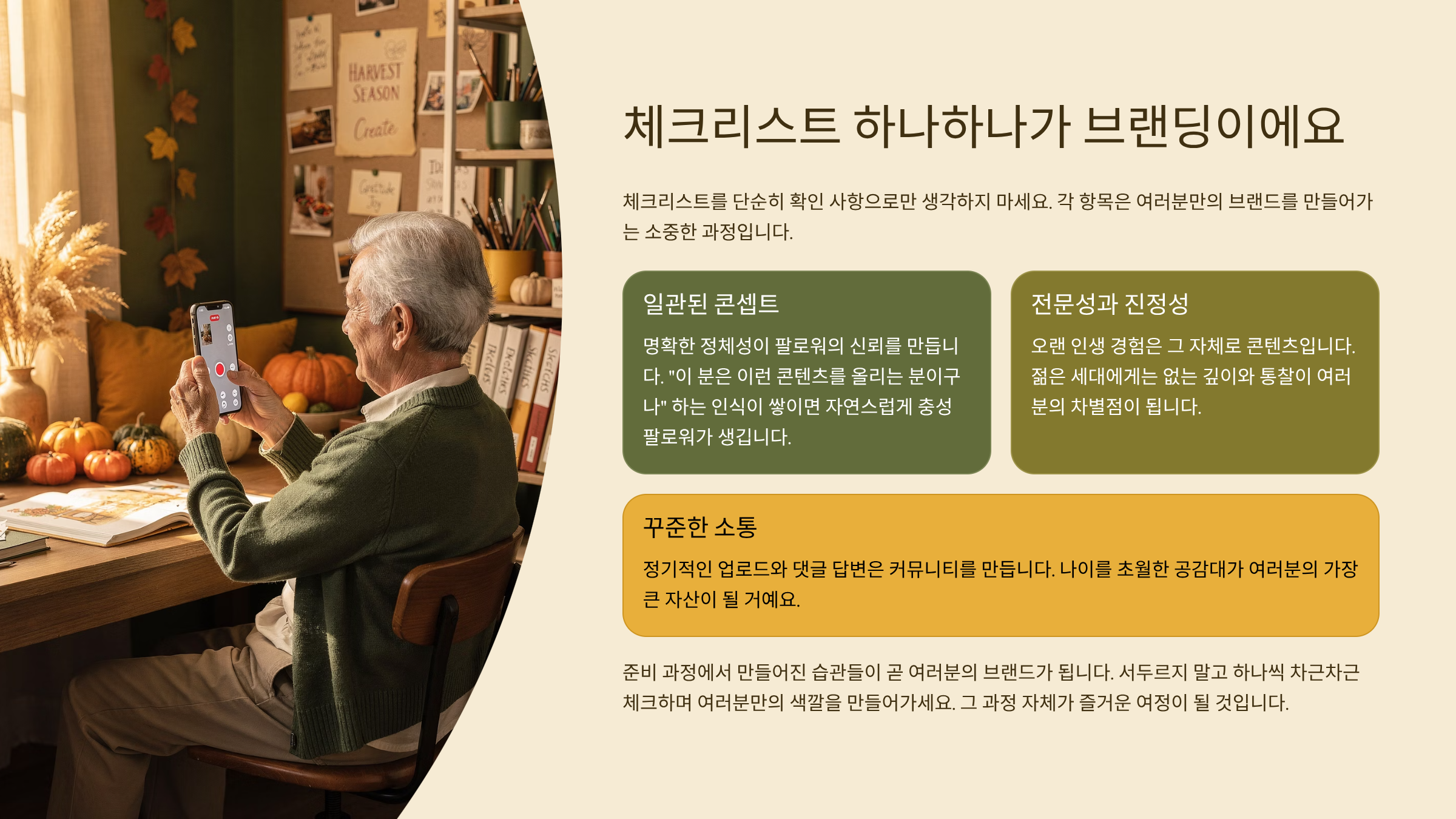 ‘어떤 모습으로 보이고 싶은가’, ‘누구에게 말을 걸고 싶은가’, ‘내 콘텐츠는 어떤 색인가’ 같은 질문들이 당신을 브랜드로 만들어줘요. 실버 세대일수록 이 질문은 더 깊고 강력한 메시지가 될 수 있어요.