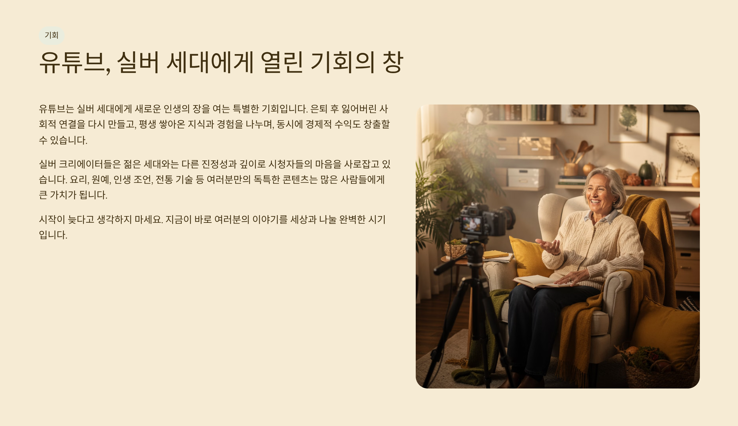 ※ 본 콘텐츠는 실버 인플루언서의 유튜브 학습에 대한 일반 정보이며, 개인의 학습 속도와 상황에 따라 결과는 달라질 수 있어요. 본인의 상황에 맞게 조절하며 활용해 주세요.