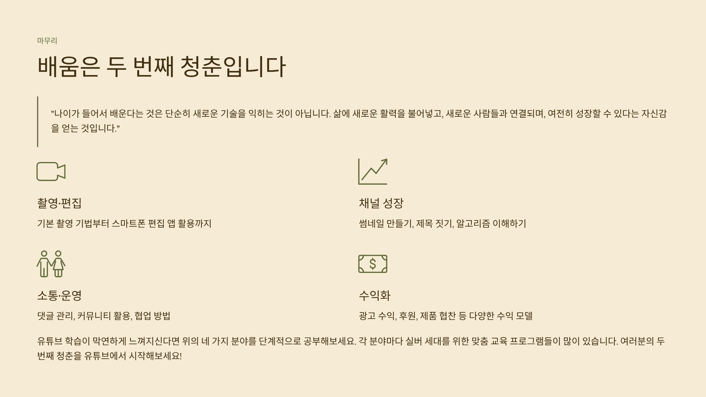 하지만 유튜브는 올리기보다 ‘꾸준히 운영하는 것’이 더 중요해요. 그러기 위해서는 배움이 필요해요. 편집, 촬영, 기획, 말하기까지… 실버 유튜버에게도 공부는 선택이 아닌 필수예요.