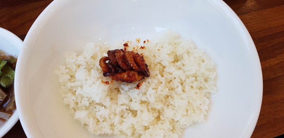 일단 샐러드와도토리해물전은 뒤전으로 하고 바로 쭈꾸미볶음을 먹기 시작하였습니다. 시작이 반찬이라고 정말 비주얼 죽이지 않습니까? 밥과 함께 쭈꾸미볶음을 덜어 비벼서 도토리묵사발과 함께 시원하게 국물을 마시면서 드시면 아주 시원함과 매운맛의 조화가 감탄이 절로 나옵니다. 너무 매운것을 못드시는분들올 위해 새우튀김이 있어 저희도 새우튀김을 하나 달라고 해서 매운입맛을 중화를 시켜주는것 같아 괜찮았습니다.