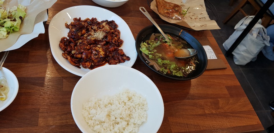 어느정도 먹으니 본메뉴가 등장했습니다. 여기서 주의사항은 어린이들은 쭈꾸미볶음이 정말 맵습니다. 자스민차로 매운것을 좀 씻어 주시면 어린이들이 먹을수가 있을겁니다.