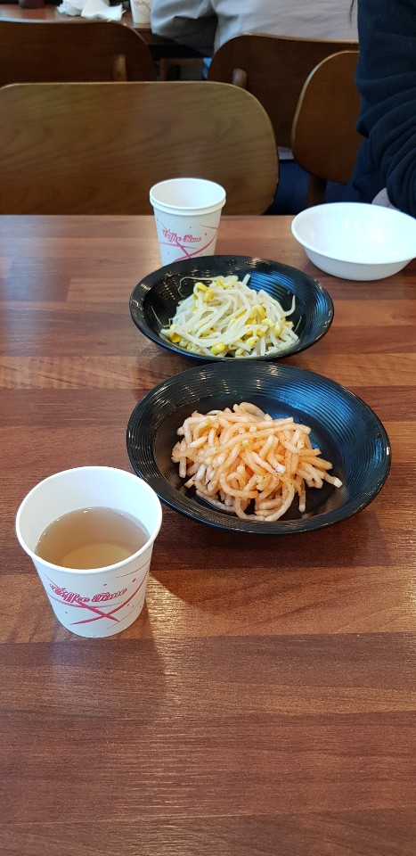 맨처음 밑반찬으로 콩나물,무채를 먼저 가져도 주시드라고요. 배가 고파 몇젖가락 콩나물을 먹었습니다. 콩나물은 양념이 안되어 있어 그냥 심심해요. 자스민차를 주는데 종이컵을 사용해서 드시면 됩니다. 따뜻한 자스민차입니다.