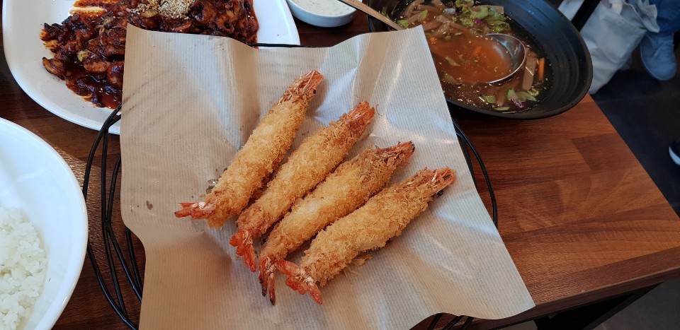 일단 샐러드와도토리해물전은 뒤전으로 하고 바로 쭈꾸미볶음을 먹기 시작하였습니다. 시작이 반찬이라고 정말 비주얼 죽이지 않습니까? 밥과 함께 쭈꾸미볶음을 덜어 비벼서 도토리묵사발과 함께 시원하게 국물을 마시면서 드시면 아주 시원함과 매운맛의 조화가 감탄이 절로 나옵니다. 너무 매운것을 못드시는분들올 위해 새우튀김이 있어 저희도 새우튀김을 하나 달라고 해서 매운입맛을 중화를 시켜주는것 같아 괜찮았습니다.