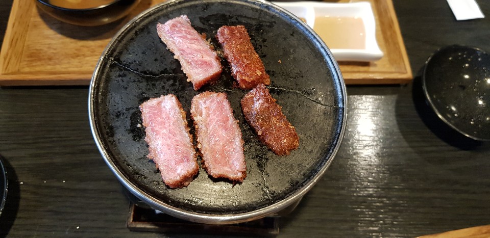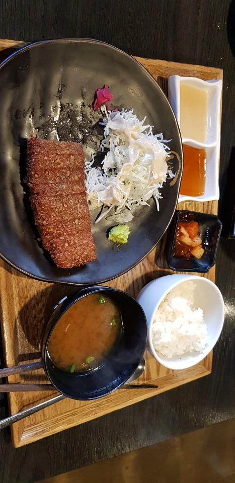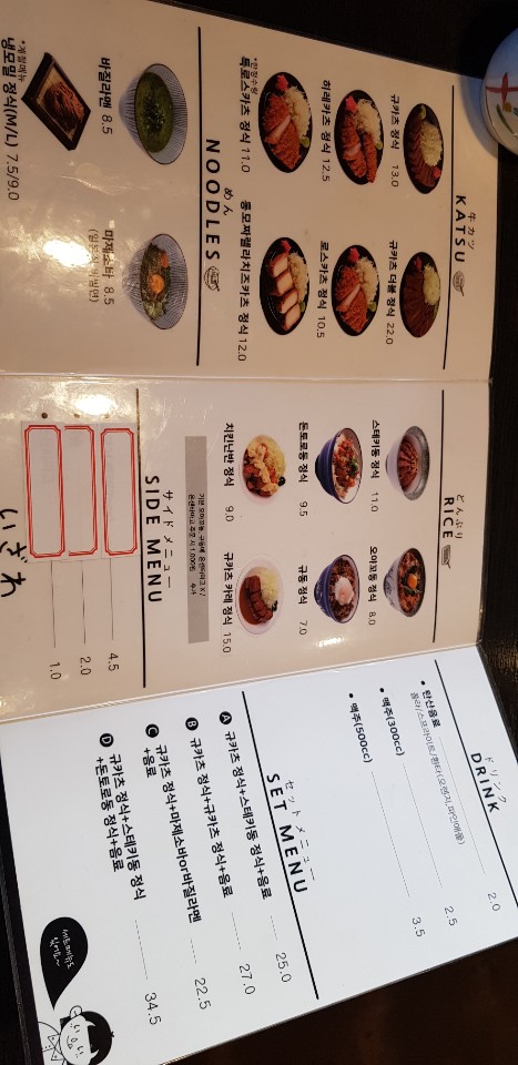 들어가시 자리가 딱 한곳이 남아 있어 빨리 자리에 착석하고 메뉴판을 가져다 주셔서 우리는 큐카츠 정식을 주문을 했습니다. 규카츠 정식도 꽤 고기가 많이 나와서 먹을만 합니다.