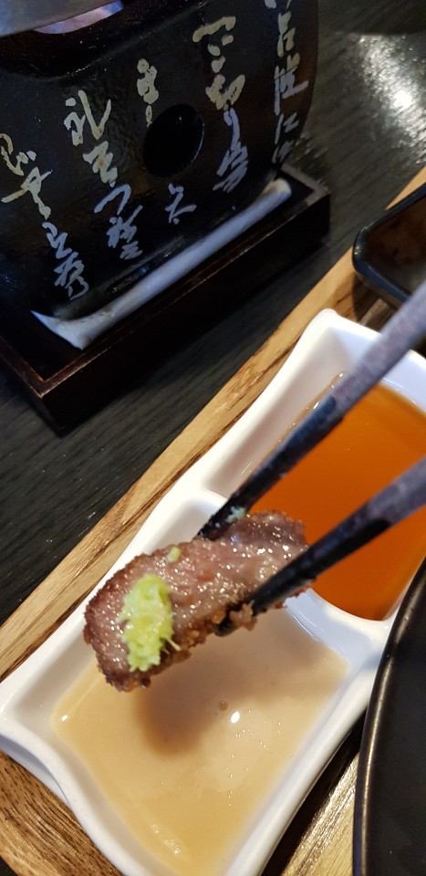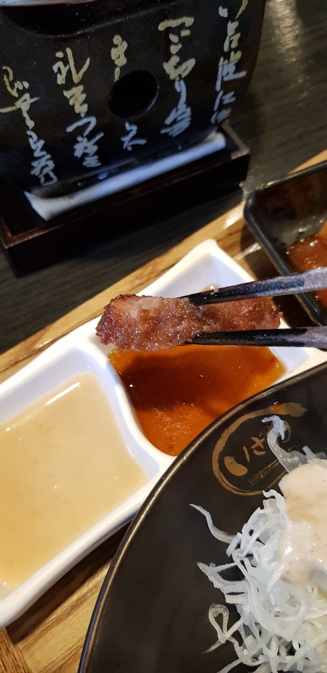 이번은 규카츠를 소스에 찍어서 먹어 보겠습니다.