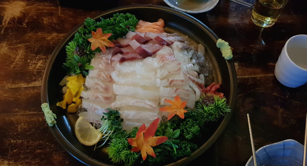 이자야카 수작에서 오늘의 사시미는 메뉴는 계절에 따라 싱싱한 활어회가 다양하게 나오는곳이에요.