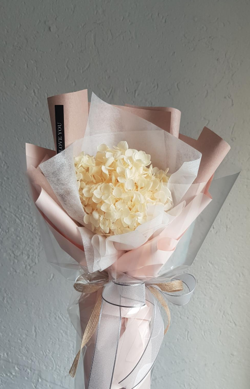 젤루야 가족 중 생일이 있어 저녁에 순수한 느낌의 프리저버 드 수국 꽃다발로 선물로 드리려고 준비했어요.