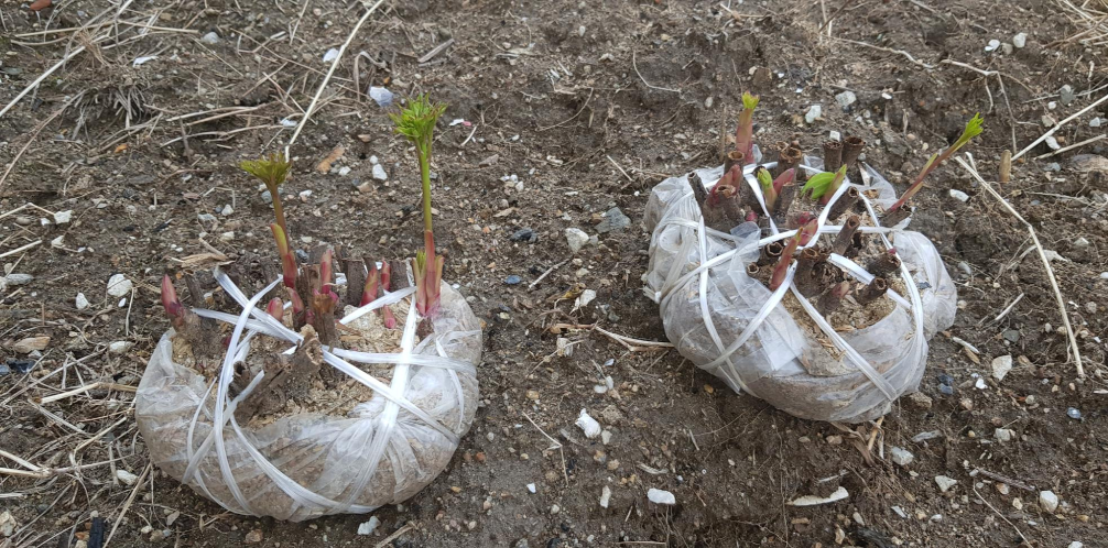 일단 작약 모종을 이렇게 생겼어요. 비닐에 쌓여 있는 모습입니다.